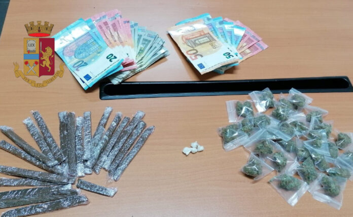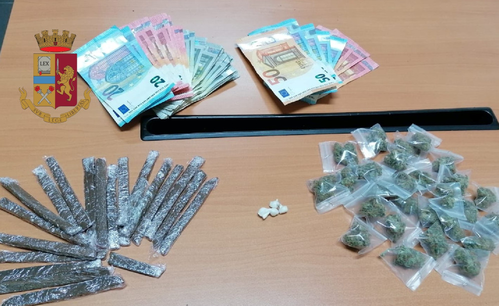 I poliziotti hanno raggiunto e bloccato i due spacciatori trovandoli in possesso di 400 euro mentre nel passaruota dell’auto hanno rinvenuto una busta contenente 27 bustine con 32 grammi circa di marijuana, 20 stecche di hashish per circa 70 grammi e 4 involucri con circa 1,2 grammi di cocaina.