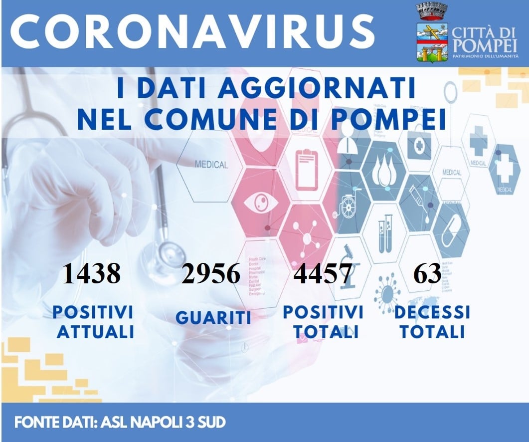 Da inizio crisi epidemica salgono a 4.457 le persone colpite dal coronavirus nel comune di Pompei.