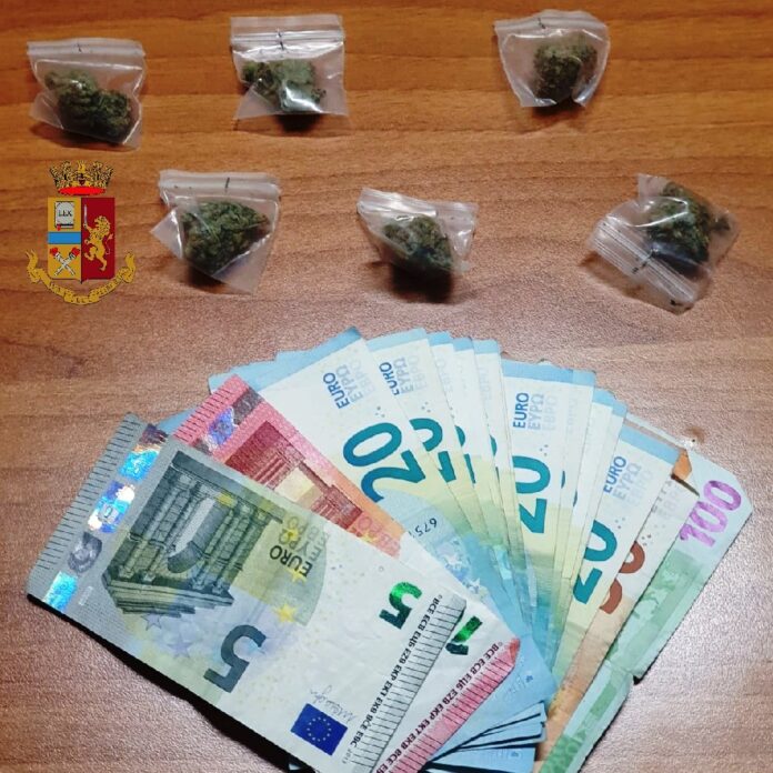 I poliziotti hanno raggiunto e bloccato lo spacciatore trovandolo in possesso di sei bustine contenenti 6,5 grammi circa di marijuana, un cellulare e 405 euro.