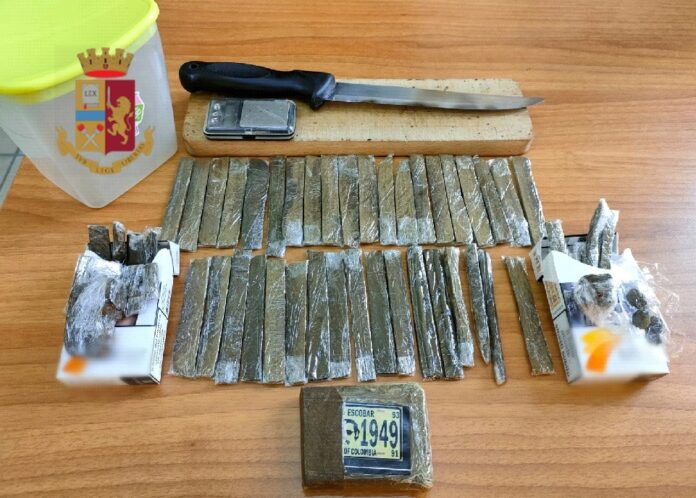 I poliziotti, con il supporto dell’Unità Cinofila dell’Ufficio Prevenzione Generale, hanno rinvenuto, all’interno di una busta nascosta dietro un mobile nella sala da pranzo, 37 stecche, 1 tavoletta e 16 pezzetti di hashish per circa 281 grammi, un bilancino di precisione, un tagliere e un coltello con la lama di 18 cm.