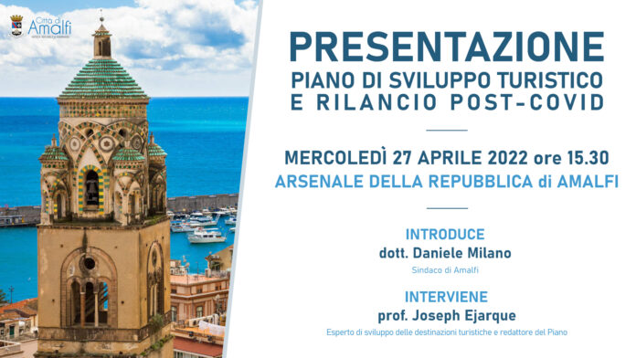 La presentazione del Piano si terrà mercoledì 27 aprile alle ore 15:30, presso l’Arsenale della Repubblica di Amalfi. Interverrà il redattore del Piano prof. Josep Ejarque (FTourism & Marketing), uno dei massimi esperti del Destination Marketing e Destination Management internazionale in Italia.
