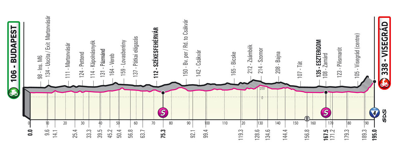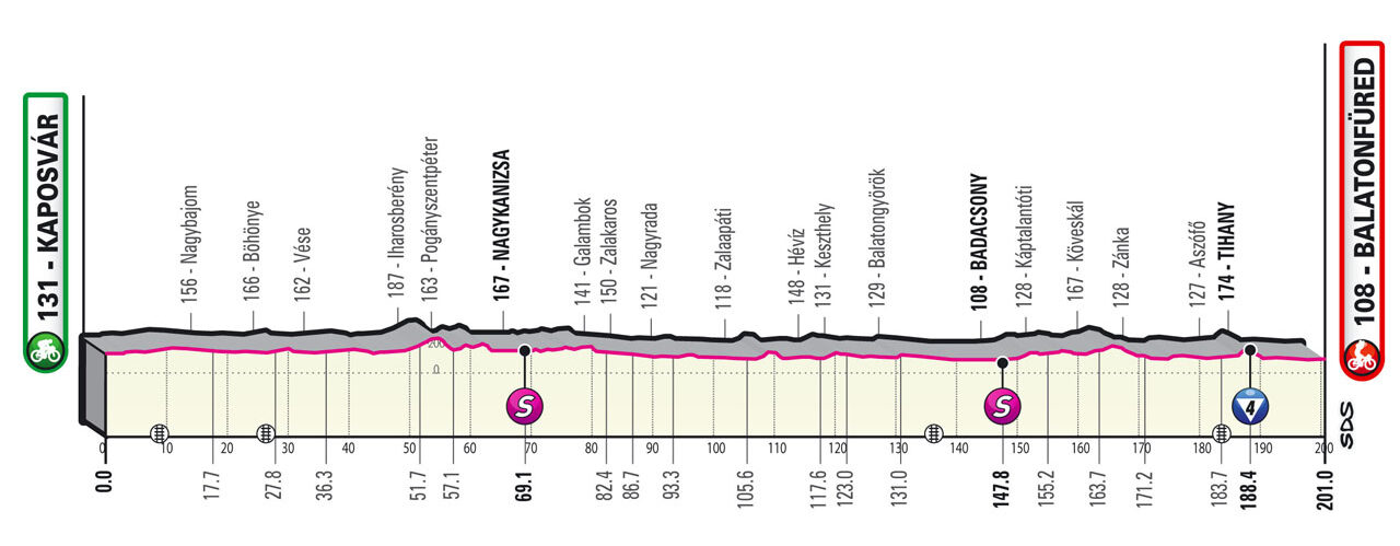 Ultima tappa in Ungheria prima del primo giorno di riposo, prima tappa in cui si superano i 200 chilometri. Malgrado questo aspetto, la difficoltà è minima, una sola stellina in un tracciato in cui l’altitudine sarà stabile, con leggere salite solo poco dopo il 50° chilometro e verso l’arrivo.