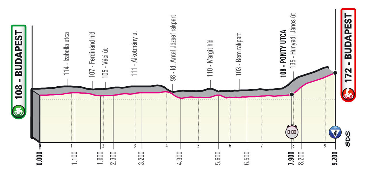 La corsa rosa prende il suo via in terra ungherese, dove nella capitale Budapest avrà ufficialmente inizio il Giro. Altitudine stabile, questa prima tappa verrà decisa soprattutto negli ultimi 5 chilometri. Sono due stelle di difficoltà.