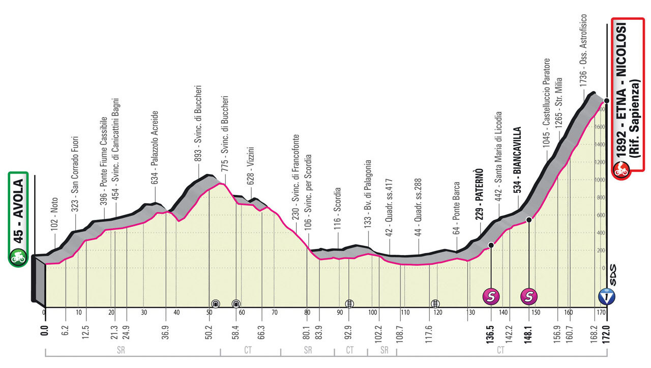 Tappa killer, la prima nel Bel Paese. Si parte dalla Sicilia, dove la partenza è a soli 45 metri sul livello del mare per poi arrivare ad una quota di quasi 1900 metri di altezza. Sarà una tratta di lunghezza media, ma faticosissima. Quattro stelline di difficoltà.