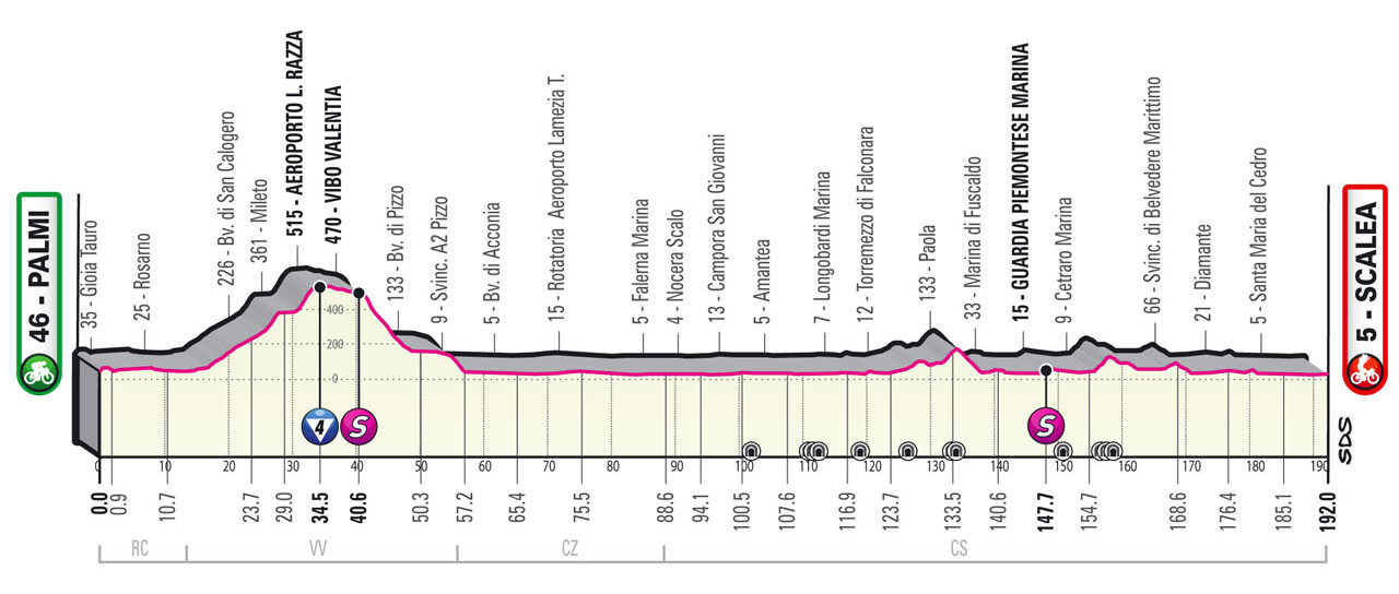 Due stelline di difficoltà anche per la sesta tappa, dove l’unica tratta in cui i corridori saranno costretti a rallentare è dai 34 ai 40 chilometri, dove poi, con l’arrivo a Vibo Valentia, si tornerà a pedalare a pochi metri sul livello del mare.