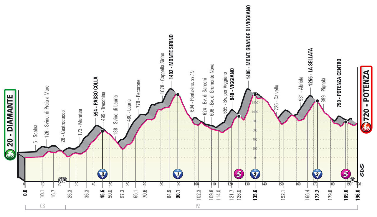 Tappa interessante, con i primi 100 chilometri in graduale salita fino a sfiorare i 1000 metri di altitudine. Da non sottovalutare altri due GPM che coglieranno i ciclisti stanchi, uno al 151° chilometro, l’altro al 173°. Poi fino a Genova sarà un percorso non estremamente difficile. Sono tre stelle.