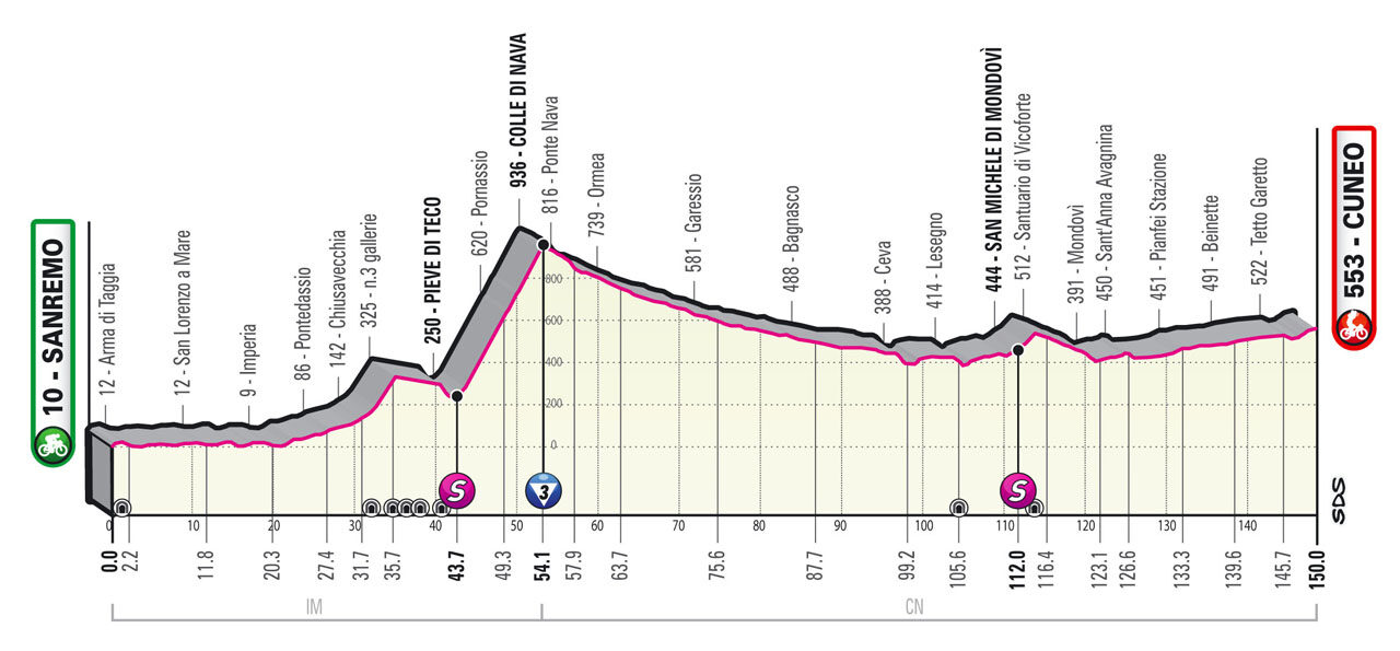 Due stelline di difficoltà, l’unica tratta tosta è il vertiginoso GPM, che vedrà i corridori salire di 700 metri sul livello del mare in meno di 10 chilometri. Poi tracciato senza insidie fino a Cuneo, dove chi ha staccato in salita ha l’occasione di allungare.