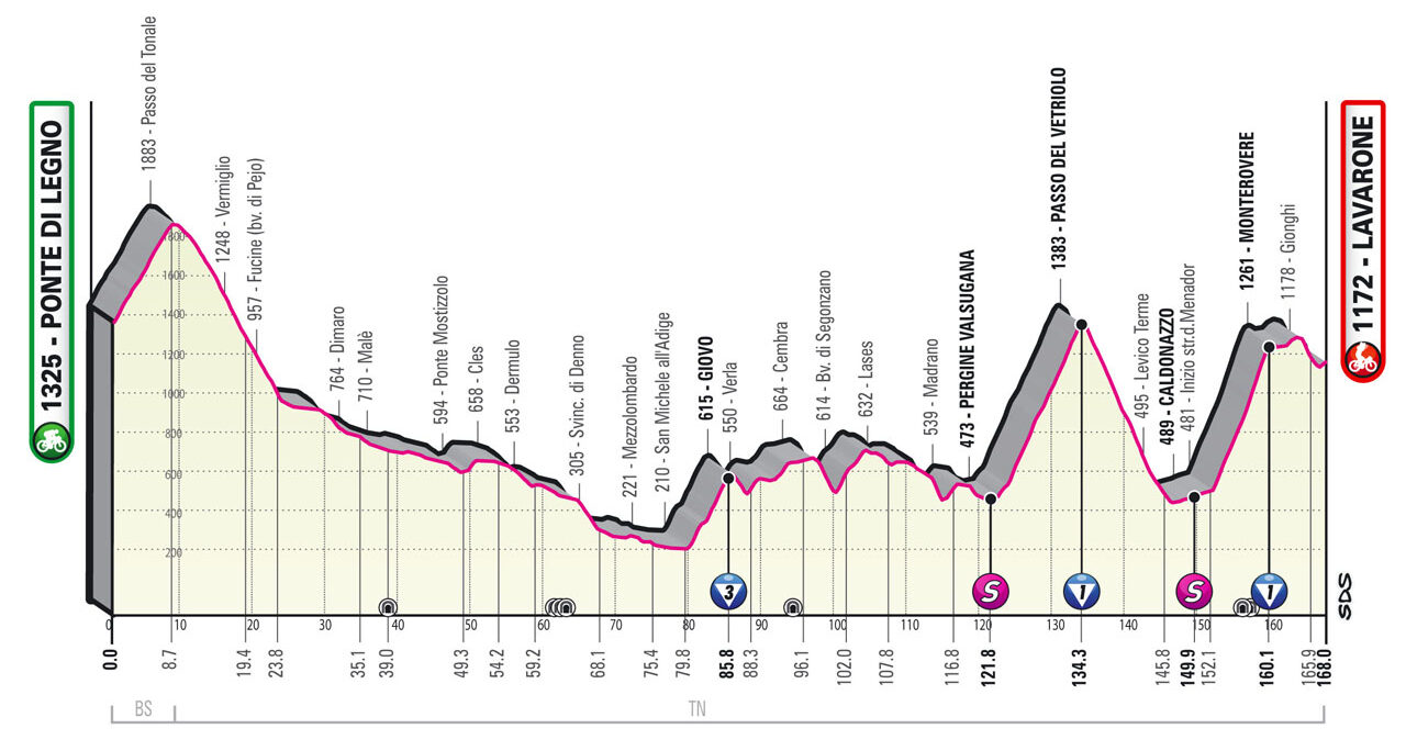 Si parte ad un’altitudine non indifferente, graduale discesa fino a metà tappa, dove c’è una prima salita, che fa da antipasto ai GPM ancora più pesanti del Passo del Vetriolo e del Menador. Quattro stelle di difficoltà.