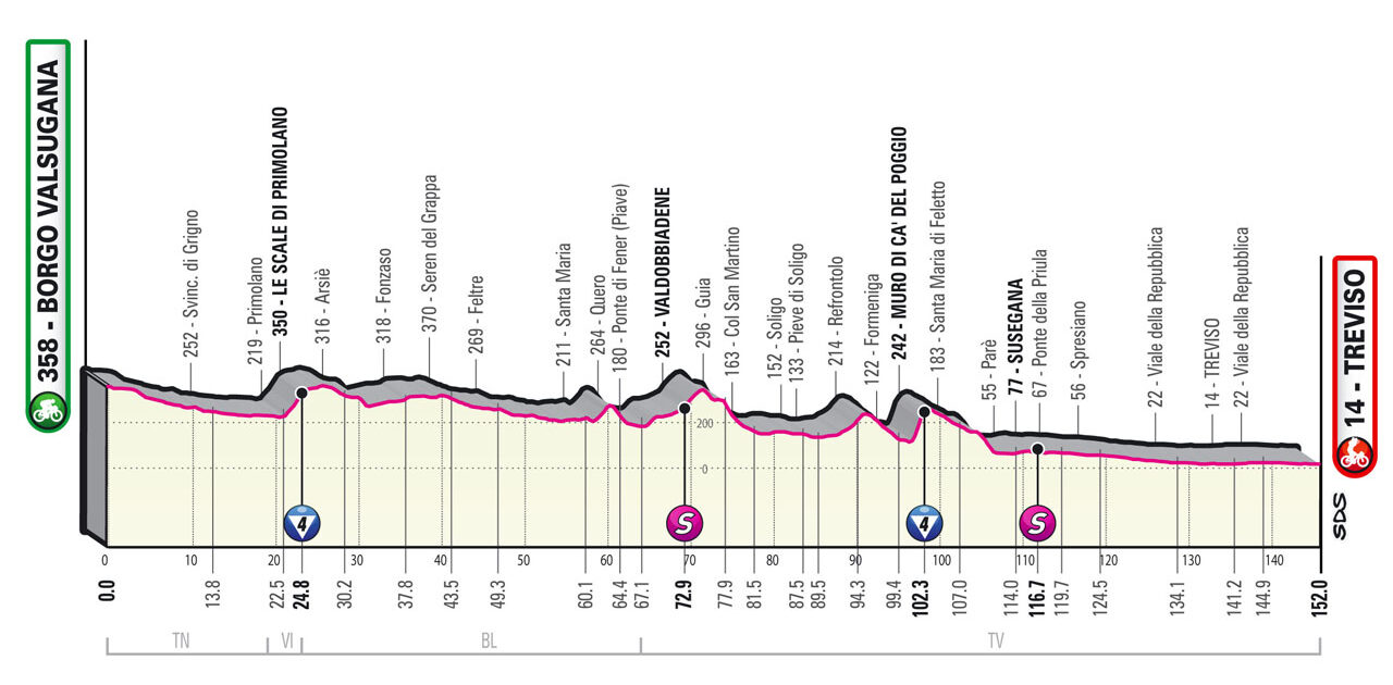 Una sola stella di difficoltà per un tracciato che sembra la quiete dopo la tempesta di quattro tappe ricche di GPM e fatica. Salite moderate, l’ultima quarantina di chilometri in lieve discesa verso Treviso sarà sicuramente quella in cui ci sarà lo strappo finale per la vittoria della tappa.