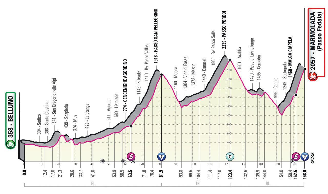 Penultima tappa, e, nonostante siano allo stremo, i corridori devono usare le loro ultime energie su un altro tracciato da cinque stelline di difficoltà. Da Belluno si sale fino a superare abbondantemente i 2000 metri sul livello del mare, poi una leggera discesa accompagnerà i ciclisti fino alla Marmolada.