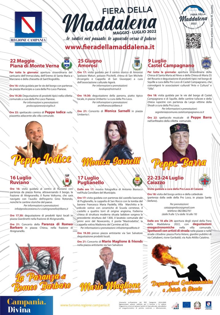 Si inizia a Piana di Monte Verna, dove, il 22 maggio, si esibirà il noto comico Peppe Iodice, reduce dai successi del PeppyNight. Il 25 giugno ad Amorosi è previsto il concerto di Monica Sarnelli, nota al pubblico nazionale, tra l’altro come interprete della sigla di Un posto al Sole, mentre il 9 luglio a Castel Campagnano andrà in scena un concerto di uno dei più grandi interpreti viventi della tradizione musicale napoletana, Peppe Barra. Il 16 luglio a Ruviano salirà sul palco la Paranza di Romeo Barbaro, il 17 a Puglianello si esibiranno Mario Maglione & Friends. Gran finale a Caiazzo dal 22 al 24 luglio per la Fiera della Maddalena: dalle 18 alle 24 saranno aperti gli stand nella villa comunale, saranno promosse degustazioni enogastronomiche gratuite e si terranno spettacoli di artisti di strada nelle piazze e nelle strade cittadine. Inoltre, per la prima volta, sarà promossa una mostra virtuale di immagini di antiche licenze commerciali e di foto di botteghe storiche caiatine, all’indirizzo www.fieradellamaddalena.it Direttore artistico della manifestazione è Michele M. Ippolito, che ha al suo attivo il coordinamento di grandi eventi quali il Premio Massimo Troisi, il Festival Ethnos, il Giorno del Gioco, il Fantasy Day.