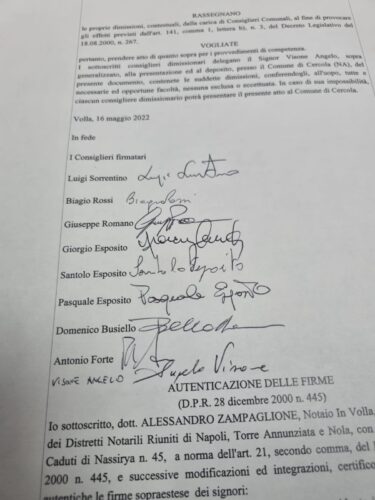 La squadra dei nove firmatari si è così composta: Domenico Busiello, Santolo Esposito, Antonio Forte, Giuseppe Romano e Luigi Sorrentino, che sino a ieri erano uomini di maggioranza che hanno voltato le spalle al sindaco. Ad affiancare questi cinque i quattro di opposizione: Giorgio Esposito, Pasquale Esposito, Biagio Rossi, Angelo Visone.