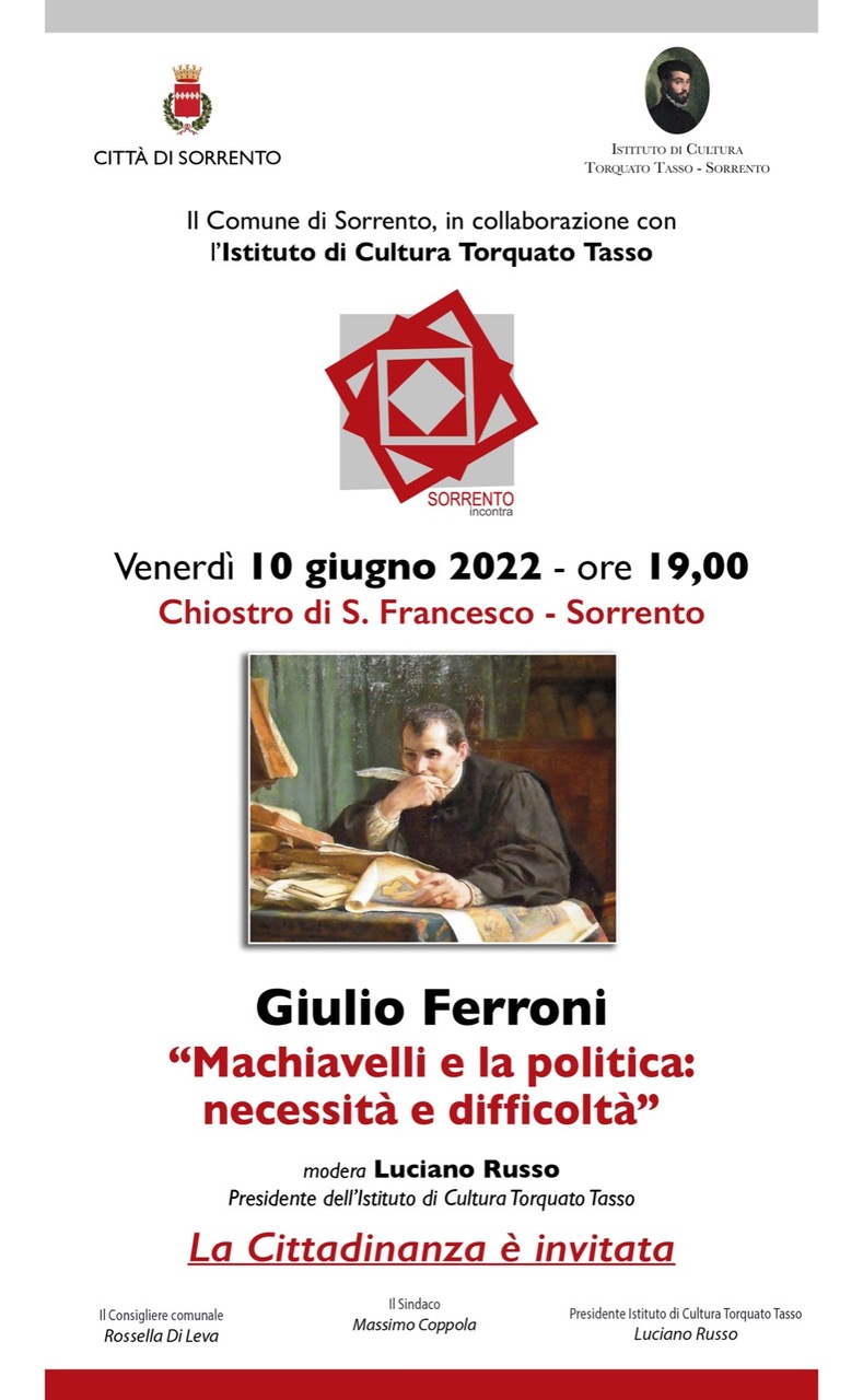 Venerdì 10 giugno, alle ore 19, al chiostro di San Francesco, Giulio Ferroni, storico della letteratura e docente universitario, in dialogo con Luciano Russo, presidente dell’Istituto di Cultura Torquato Tasso, terrà una lezione dal titolo “Machiavelli e la politica: necessità e difficoltà”.