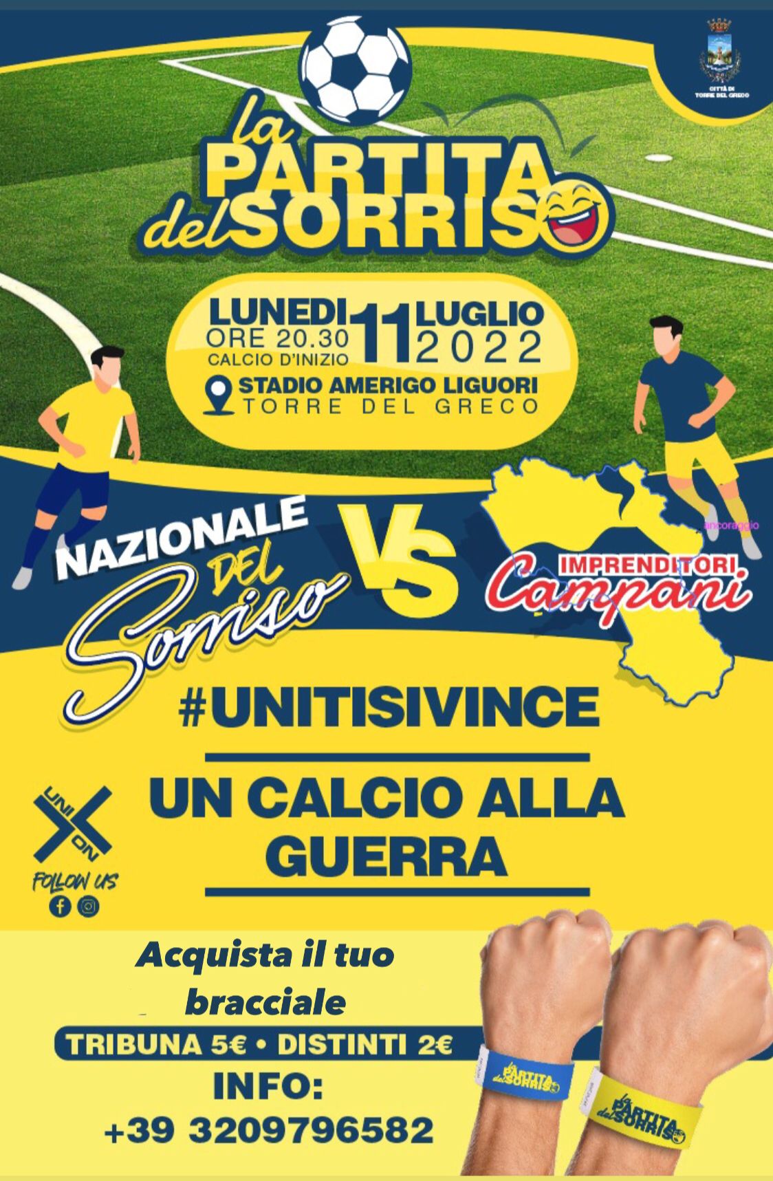 Due le nazionali di calcio coinvolte, una composta da attori e da personaggi dello spettacolo l’altra da imprenditori campani, l’incasso sarà devoluto a tre Associazioni: “Gli occhi di Claudio”, “Uniti per la Vita” e “Camminiamo insieme”, il ricavato andrà anche a favore dei corridoi umanitari, fornirà supporto ai cittadini ucraini in guerra e alle loro famiglie coinvolte e sarà funzionale alla spedizione di materiale sanitario e generi alimentari. Per la Nazionale del Sorriso sono confermati Francesco Cicchella, Patrizio Oliva, Alessio Gallo, Marco Maddaloni, Gianluca Di Gennaro, Andrea Petri, Diego Laurenti, Roberto Oliveri, Davide Marotta, Ivan Boragine, Ciro Petrone, Vincenzo Durevole, Emanuele Calaiò, Ciro Giustiniani, Ciro Villano, Gennaro Scarpato, Renato Biancardi, Giovanni Buselli, Vincenzo Messina, Ciro Ceruti, Emanuel Ceruti, Paco de Rosa, Mario Fargetta, Gabriele Esposito, Decibel Bellini, Irma Testa, Angelo di Gennaro, Pasquale Palma, Alessandro Palladino, Cristiano Di Maio, Mirko Ciccariello, Oreste Ciccariello, Domenico Morra, l’allenatore sarà Biagio Zurlo, l’arbitro Marcello Ambrosino. Prima della partita ci saranno dei momenti musicali e di aggregazione con la cantante e attrice Anna Capasso, lo speaker radiofonico Il Conte Max, il dj Erick D’Urzo e Decibel Bellini, storico speaker del Calcio Napoli.