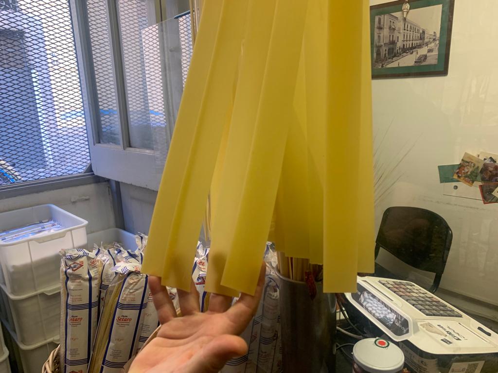 Rientriamo, Vincenzo ha da lavorare. Un vecchietto è appena entrato nello stabilimento: vuole acquistare un pacco di pasta “ammiscata”. Residui di lavorazione fatti di spaghetti e linguine spezzati, ottimi per la pasta con le patate, con i fagioli. L’anziano ammira quei pacchi come fossero gioielli, se ne rigira alcuni tra le mani, quasi “assaporandone” già il gusto ed il profumo. Gioielli veri e propri.