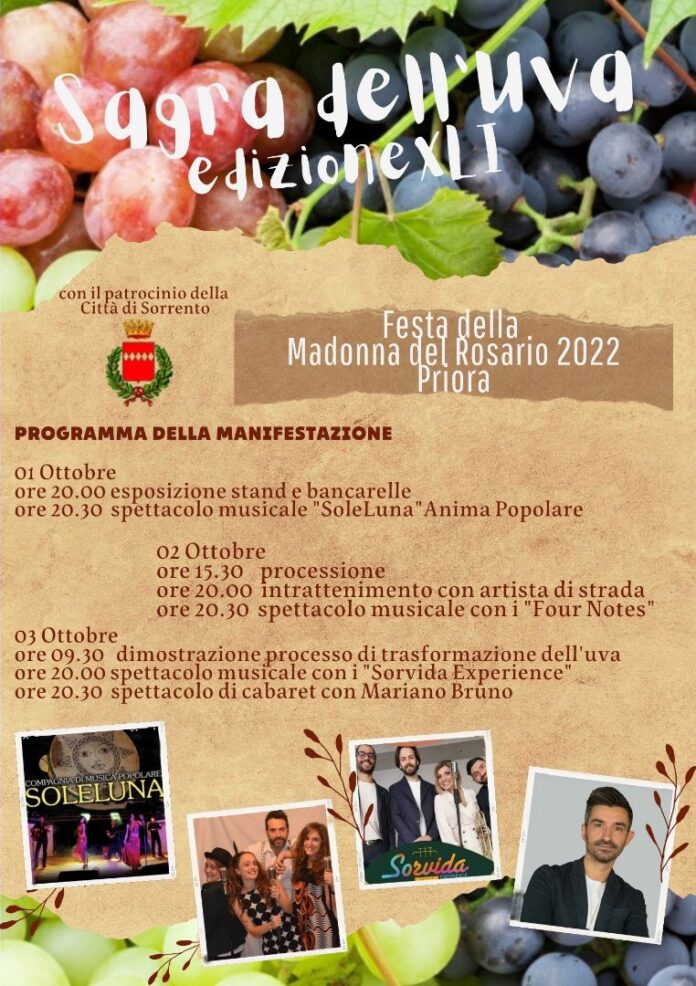 Dall’1 al 3 ottobre, in località Priora, a Sorrento, si svolge la 41ma edizione della Festa dell’Uva, che richiama nel borgo rurale, numerosi visitatori per vivere il folclore legato al rito della vendemmia.