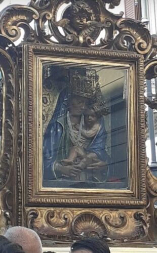 Verso mezzogiorno, le preghiere arrivarono in Cielo e la cappa nera di ceneri aprì un varco facendo passare un raggio di sole che si posò sull’Icona della Madonna della neve… Torre Annunziata fu salva ancora una volta grazie alla sua protettrice.