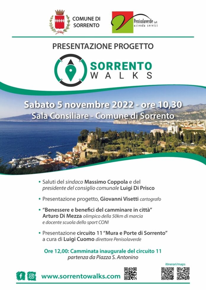 Sabato 5 novembre, alle ore 10, nella sala Torquato Tasso del Palazzo Municipale di Sorrento, si terrà la presentazione del progetto SorrentoWalks, promosso dal Comune di Sorrento e realizzato da Penisolaverde, dedicato ai camminatori ed a quanti vogliono scoprire, a piedi, le bellezze nascoste del territorio di Sorrento e della sua penisola.