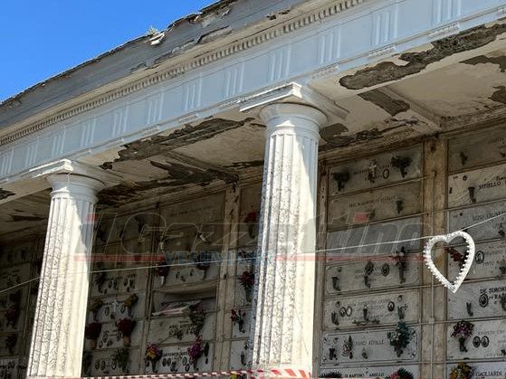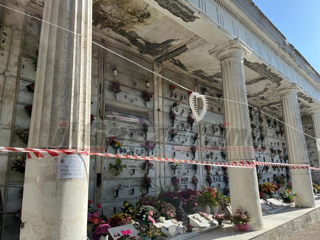 “Eeeh, da mo’ che sta così”, ci dice una vecchietta che guarda un’altra persona, la quale nonostante il divieto si è avvicinata al loculo del proprio caro per porre dei fiori e per pulire la foto. “Dice che il comune non c’ha i soldi per i lavori”, aggiunge la vecchietta.