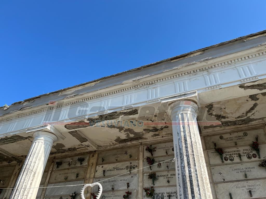 Il pensiero corre subito a quanto successo appena qualche settimana fa, per la seconda volta, al cimitero monumentale di Poggioreale a Napoli, e a ben guardare lo stato della muratura e della parte coperta, quello che era stato solo un flash si concretizza immediatamente: ampie parti di intonaco crollato, infiltrazioni e muffa che aggredisce l’intonaco che rimane, non si sa bene come, ancora attaccato.