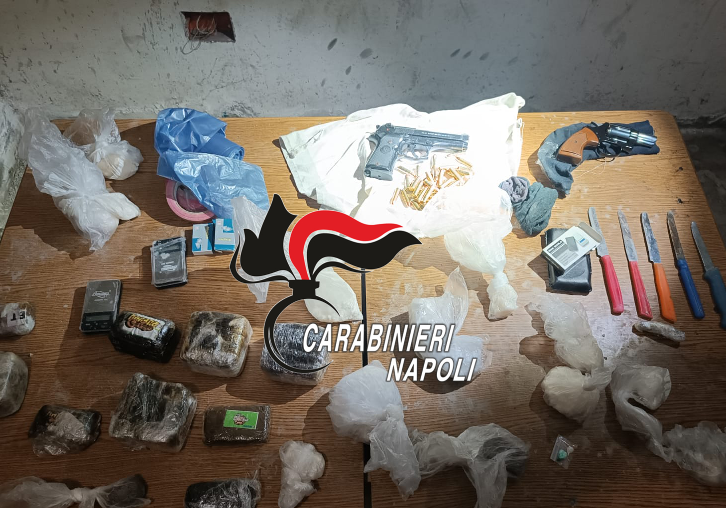 Armi ma anche droga con il sequestro di quasi 3 chili di hashish suddivisi in panetti e 570 grammi di crack. Contemporaneamente nelle palazzine popolari di Castello di Cisterna i Carabinieri hanno rinvenuto e sequestrato un pistola Beretta calibro 380 con caricatore e diverse dosi di marijuana pronte alla vendita.