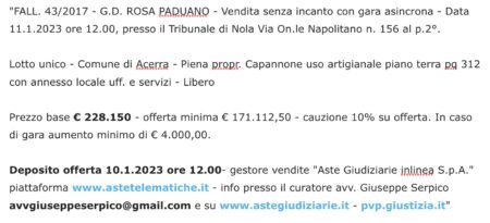 Deposito offerta 10.1.2023 ore 12.00- gestore vendite “Aste Giudiziarie inlinea S.p.A.” piattaforma www.astetelematiche.it – info presso il curatore avv. Giuseppe Serpico avvgiuseppeserpico@gmail.com e su www.astegiudiziarie.it – pvp.giustizia.it “.