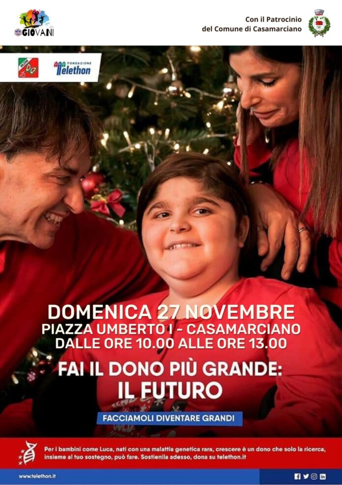 Nella giornata di domenica 27 novembre in Piazza Umberto I a Casamarciano, dalle ore 10.00 alle ore 13.00, sarà allestito il presidio per la raccolta fondi Telethon con l’Associazione UILDM di Cicciano con il sostegno delle Associazioni territoriali della Comunità di Casamarciano ed il Patrocinio del Comune di Casamarciano.