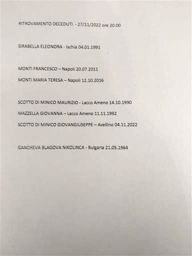Sono sette i corpi senza vita rinvenuti dai soccorritori all’opera nella zona di via Celaro a Casamicciola, comune dell’isola d’Ischia su cui nella notte del 26 novembre si è abbattuta una frana. Le sette salme sono state identificate e le loro generalità sono state rese note in occasione del punto stampa convocato in Prefettura a Napoli a margine della riunione del Centro coordinamento soccorsi.