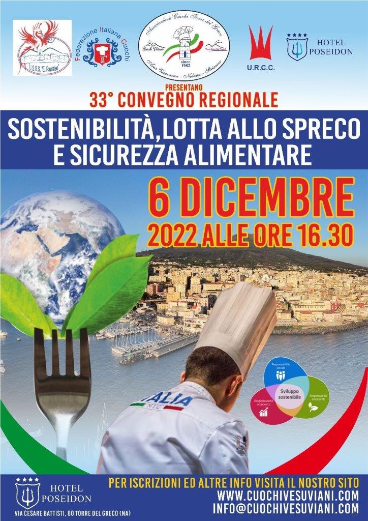 La Sostenibilità, la lotta allo spreco e la sicurezza alimentare, saranno i temi che affronteranno e sui quali si confronteranno a partire dalle ore 16:30, di martedì 6 dicembre, ospitati dall’hotel “Poseidon” di via Cesare Battisti,80 a Torre del Greco, esperti del settore, in occasione del 33° Convegno dell’Associazione Cuochi Torre del Greco Area Vesuviana Nolana Strianese.