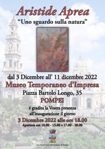 Sarà il Museo Temporaneo d’Impresa, in piazza Bartolo Longo, nella città di Pompei, ad ospitare l’ultima mostra realizzata da Aprea, già vincitore nel 2010 del primo Premio Internazionale Letterario e Artistico – Castel D’Oria di Angri. L’inaugurazione è prevista oggi, sabato 3 dicembre 2022, alle ore 18. La mostra proseguirà fino al giorno 11 dello stesso mese con il patrocinio del Comune di Pompei. Potrebbe trattarsi dell’ultima esposizione personale dopo un lungo percorso artistico iniziato da Aprea già negli anni ottanta.
