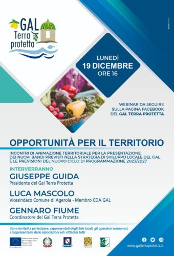 Opportunità per il territorio: tutto pronto per il webinar organizzato da Gal Terra protetta che si terrà lunedì 19 dicembre 2022 alle ore 16. Si tratta di un evento da inquadrarsi tra gli incontri di animazione territoriale per la presentazione dei nuovi bandi previsti nella strategia di sviluppo locale del Gal e le previsioni del nuovo ciclo di programmazione 2023/2027.
