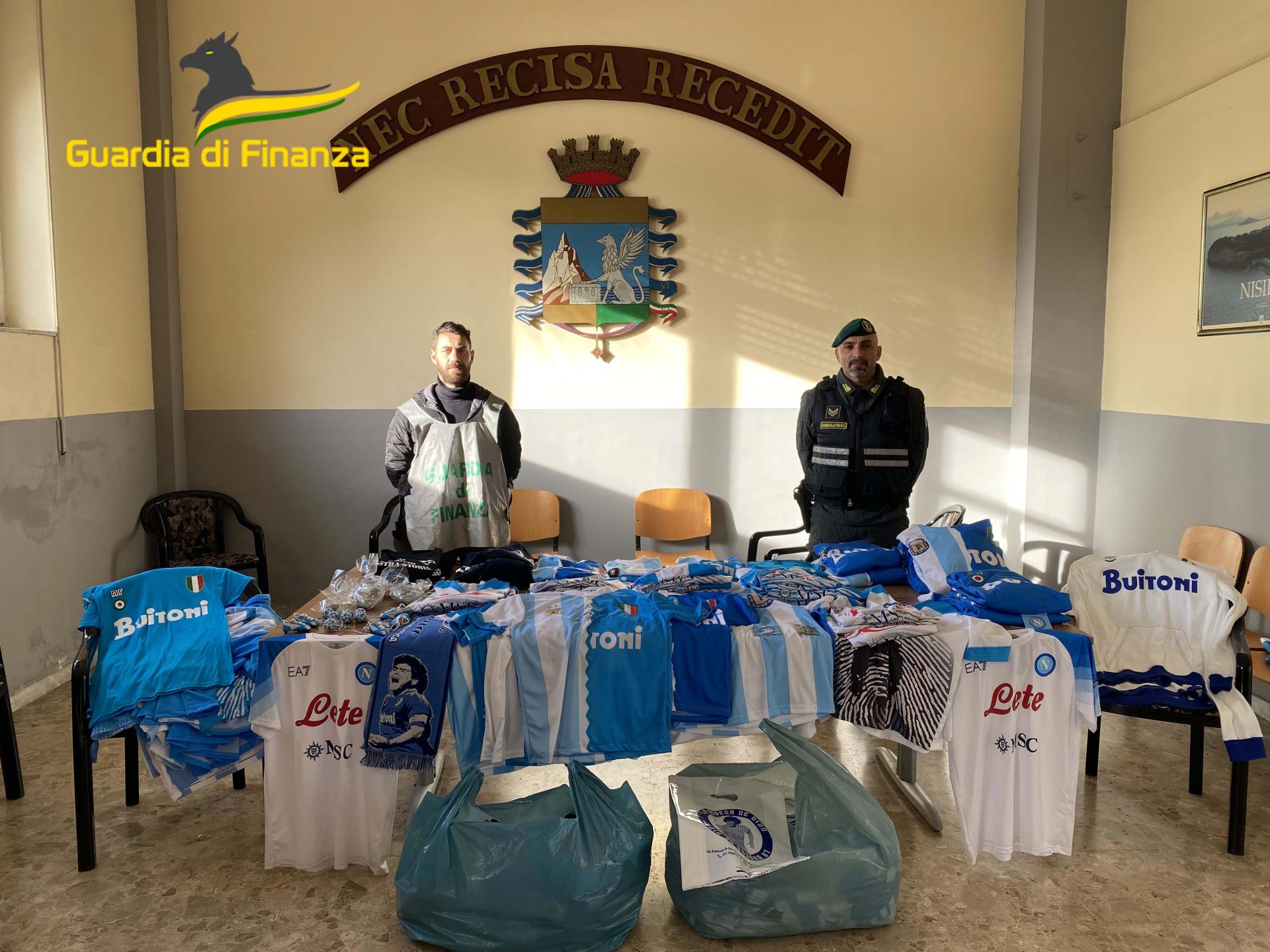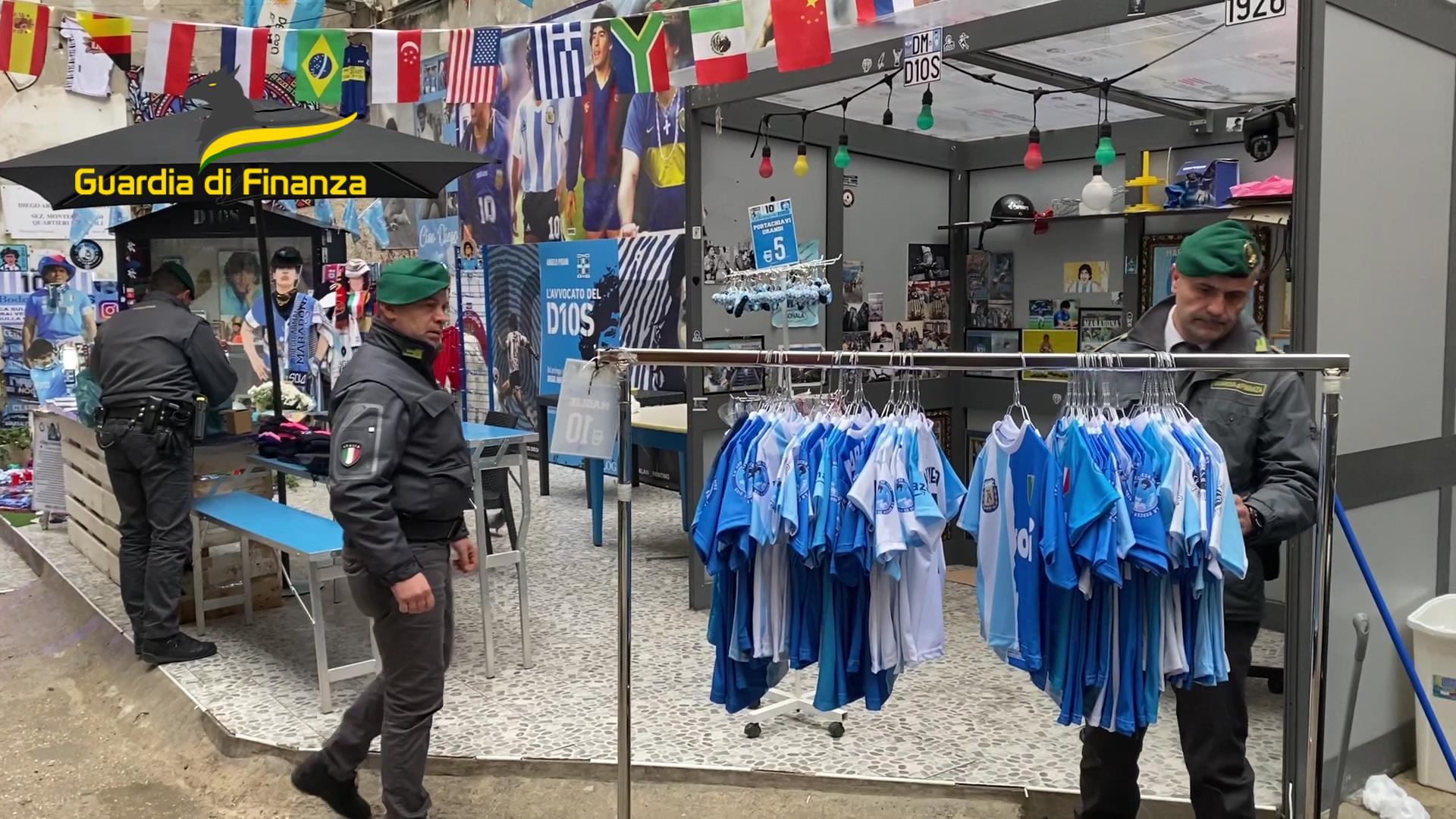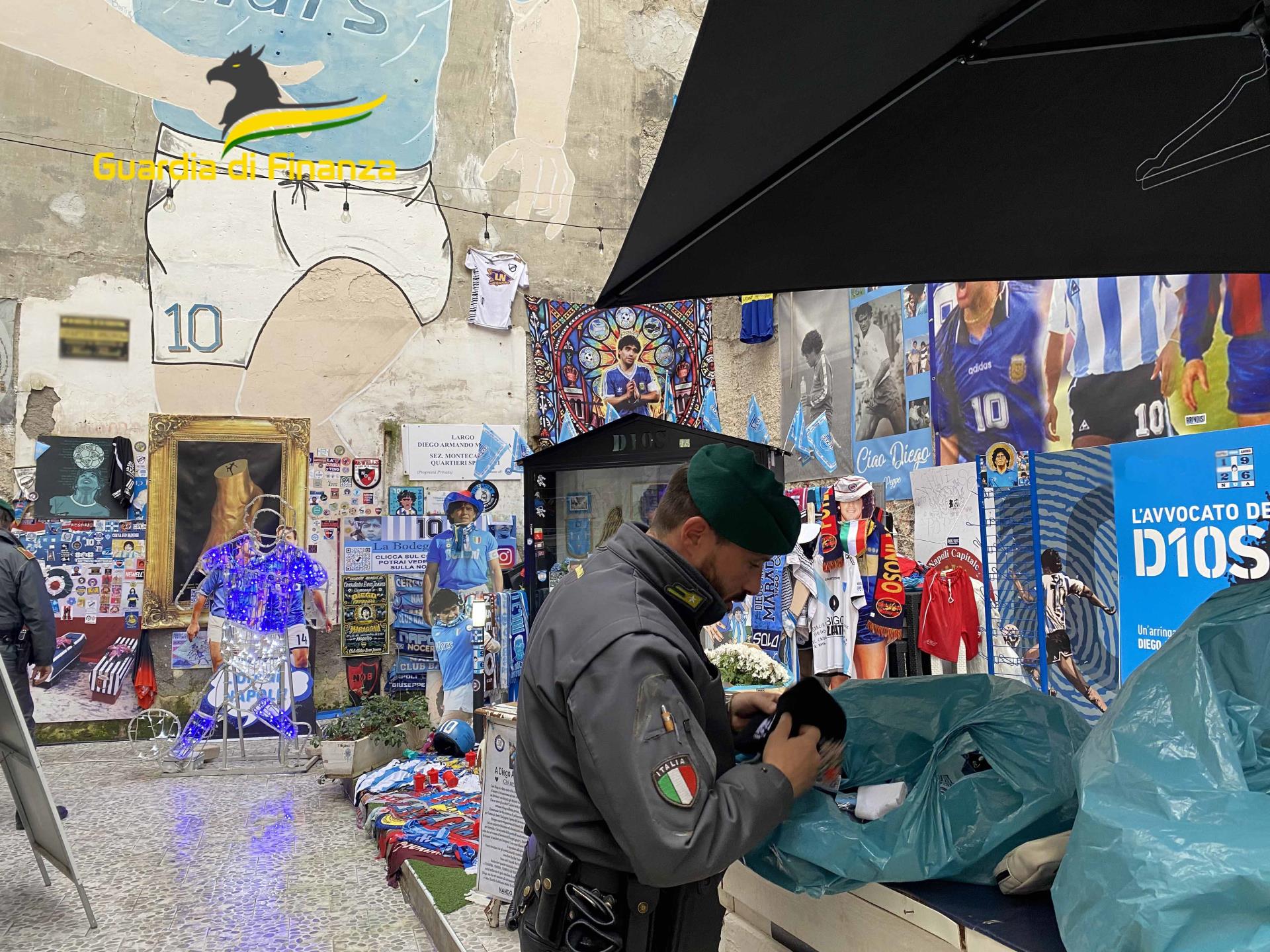 Un mercatino di prodotti d’abbigliamento e accessori di vocazione calcistica, proprio a ridosso del murales dedicato a Diego Armando Maradona: blitz della guardia di finanza a Napoli. Nel cuore dei “quartieri spagnoli” del capoluogo partenopeo, le fiamme gialle hanno sottoposto a sequestro oltre 600 articoli e accessori contraffatti, molti dei quali riproducenti i marchi e gli sponsor del Napoli Calcio e della nazionale Argentina riferiti al “Pibe de Oro”.