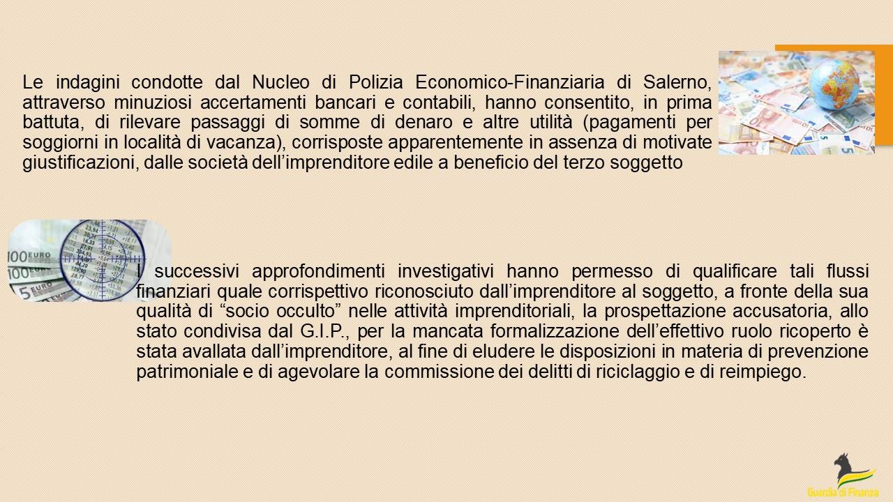 Il 44enne è già condannato per reati di associazione mafiosa, estorsione, rapina e porto abusivo e detenzione di armi. Galderisi, invece, è un imprenditore salernitano nel settore edile. Le misure cautelari sono state emesse dal gip di Salerno su richiesta dei pm. Le fiamme gialle hanno operato accertamenti bancari e contabili. L’attività ha consentito di rilevare passaggi di somme di denaro e altre utilità, corrisposte, apparentemente in assenza di motivate giustificazioni, dalle società dell’imprenditore edile a beneficio di Capri.