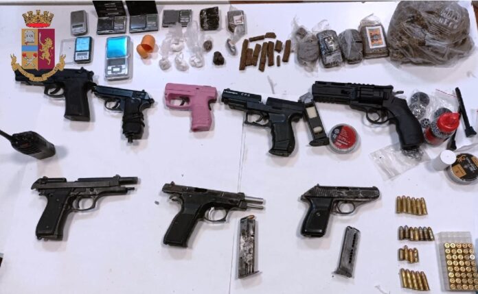 I poliziotti, insospettiti, hanno effettuato un controllo in uno stabile con il cancello di ingresso aperto dove hanno rinvenuto, tra alcuni cumuli di materiale di risulta, una busta contenente alcune parti di divise della Polizia di Stato, 22 involucri con circa 14 grammi di cocaina, 15 stecche e 8 panetti di hashish del peso complessivo di circa 495 grammi, un’altra busta contenente circa 111 grammi di marijuana, una radio portatile, tre pistole semiautomatiche, di cui una con 9 cartucce, 4 pistole a gas prive di tappo rosso, 62 cartucce di diverso calibro, di cui 40 a salve, e 8 bilancini di precisione che sono stati sequestrati.