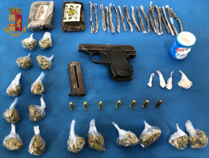 Stamattina gli agenti del Commissariato Pianura hanno effettuato un controllo nei pressi di uno stabile di via S. Josemarìa Escrivà dove hanno rinvenuto, nascosti tra diverso materiale edile, una pistola calibro 6.35 con matricola abrasa e 7 cartucce dello stesso calibro, 4 involucri contenenti circa 2 grammi di cocaina, 16 involucri contenenti circa 19 grammi di marijuana, 18 stecche di hashish del peso di circa 33 grammi e 2 panetti della stessa sostanza di circa 190 grammi che sono stati sequestrati.
