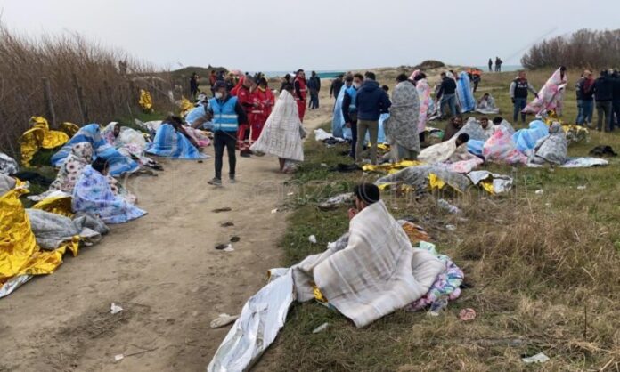 Una lunga sequela di lenzuola bianche che coprono pietosamente i cadaveri e, poco distante, accovacciati tra le basse dune di sabbia e la vegetazione mediterranea, decine di superstiti avvolti nelle coperte termiche offerte dai soccorritori, lo sguardo terreo perso nel vuoto, il pianto disperato. Sulla riva del mare i detriti del barcone sul quale viaggiavano, distrutto dalla furia del mare, insieme alle vite di molti di loro.
