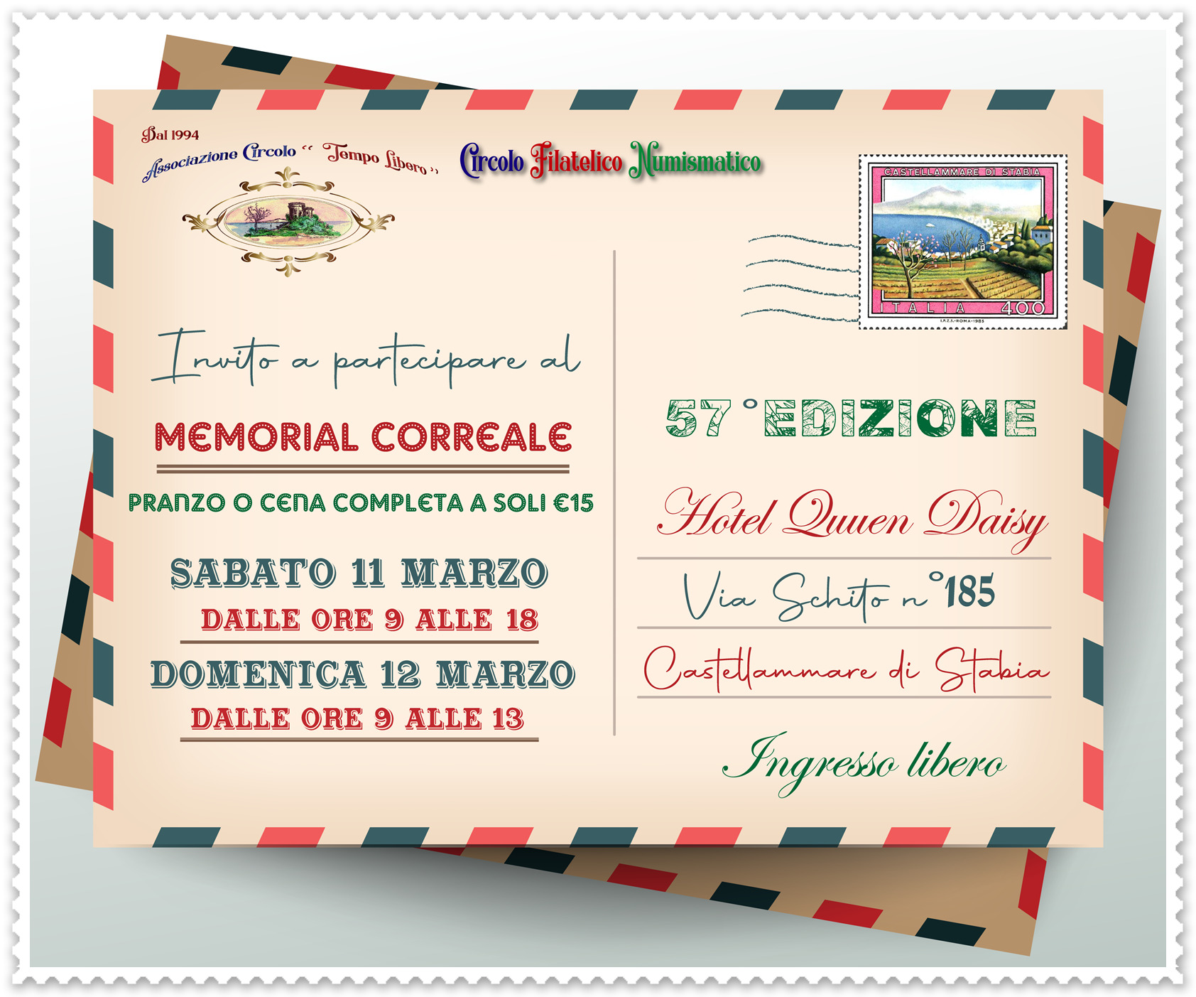 Dopo il successo delle scorse edizioni, con la 57° edizione, torna la manifestazione Memorial Correale, il tanto atteso evento del Sud Italia di numismatica, filatelia e collezionismo vario, organizzato dall’Associazione Circolo “Tempo Libero”, attirando centinaia di visitatori provenienti da ogni regione.