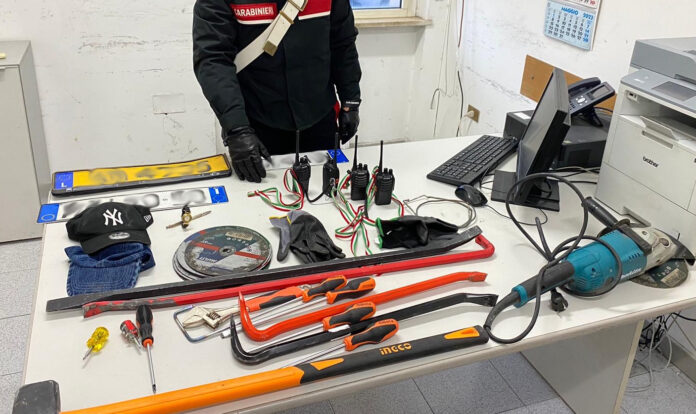 Nell’utilitaria, poi sequestrata, i carabinieri hanno trovato un kit completo per i furti: un flex, piedi di porco, guanti, cacciaviti, un enorme martello, targhe anche straniere risultate provento di furto e delle radiotrasmittenti.