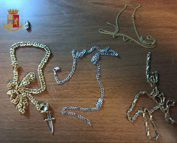 I poliziotti hanno bloccato l’uomo trovandolo in possesso delle due collane e di altre due collanine spezzate che aveva strappato ad altre due persone nella stessa serata.