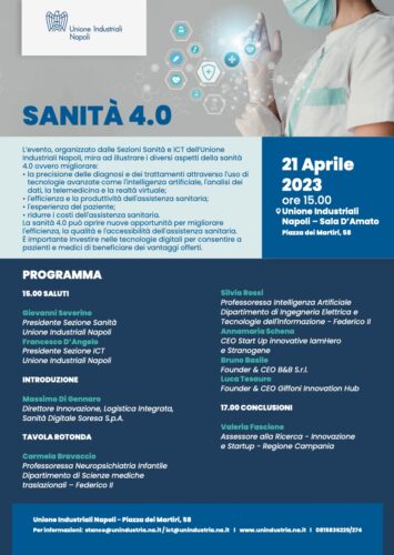 L’evento, organizzato dalle Sezioni Sanità e Ict dell’Unione Industriali Napoli, mira ad illustrare i diversi aspetti della sanità 4.0 ovvero migliorare: la precisione delle diagnosi e dei trattamenti attraverso l’uso di tecnologie avanzate come l’intelligenza artificiale, l’analisi dei dati, la telemedicina e la realtà virtuale; l’efficienza e la produttività dell’assistenza sanitaria; l’esperienza del paziente; ridurre i costi dell’assistenza sanitaria. La Sanità 4.0 può aprire nuove opportunità per migliorare l’efficienza, la qualità e l’accessibilità dell’assistenza sanitaria. È importante investire nelle tecnologie digitali per consentire a pazienti e medici di beneficiare dei vantaggi offerti.