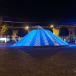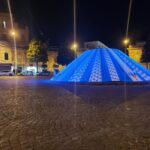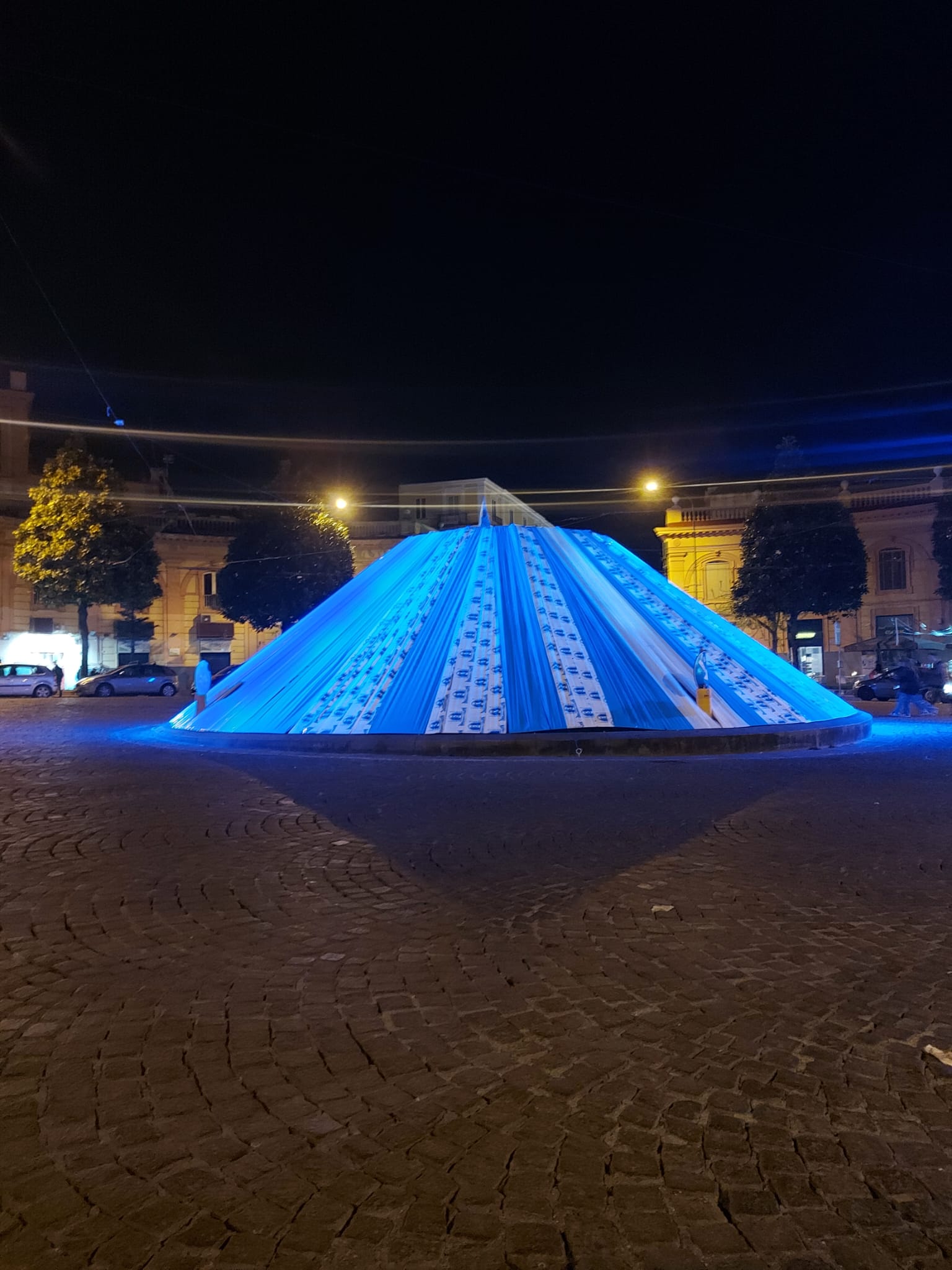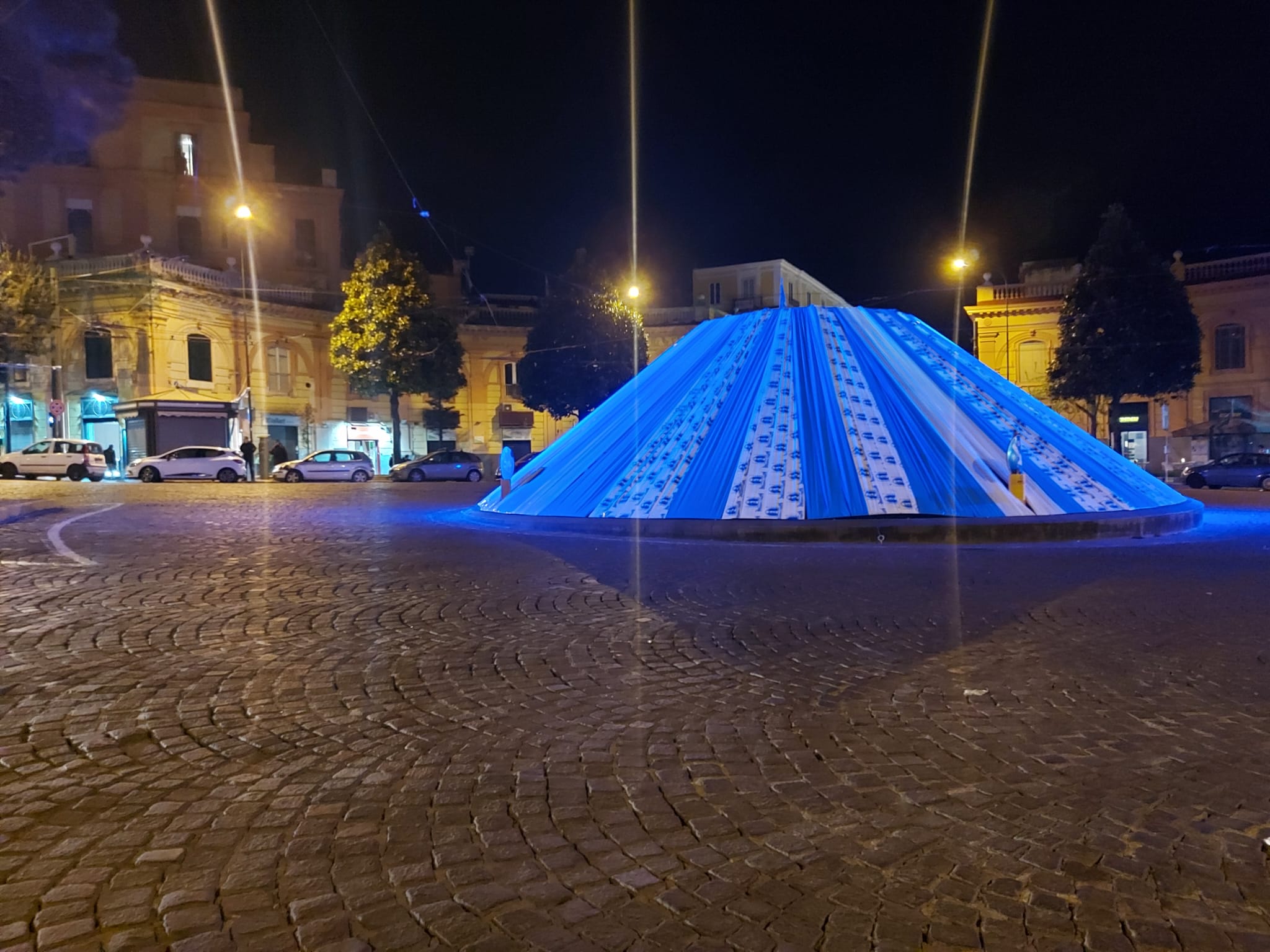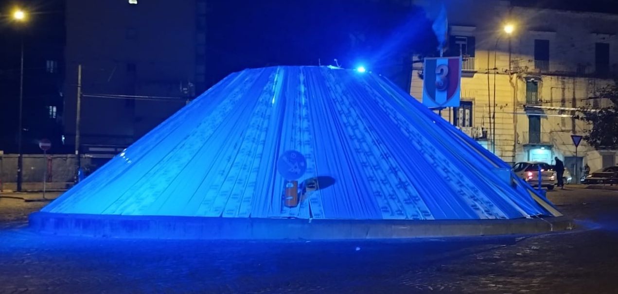 Il nostro maestoso Vesuvio è stato replicato sulla fontana della piazza grazie all’utilizzo di nastri bicolore. Il simbolo indiscusso di napoletanità e di appartenenza troneggia in una delle piazze principali, al centro di uno snodo fondamentale per la città ed esattamente difronte al mare, separato solo dal Corso Umberto.
