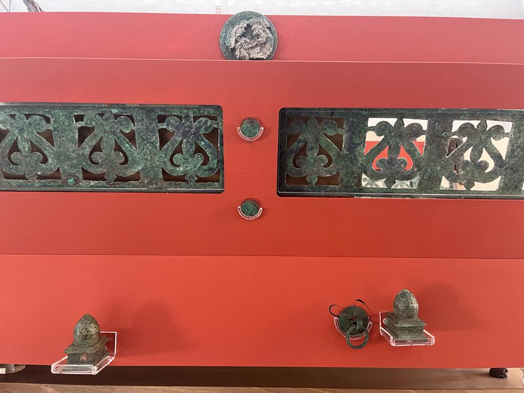 Il grande carro cerimoniale a quattro ruote, con i suoi elementi in ferro, le bellissime decorazioni in bronzo e argento, con raffigurazioni erotiche, i resti lignei mineralizzati, le impronte degli elementi organici (dalle corde a resti di decorazioni vegetali), venne rinvenuto quasi integro nel porticato antistante alla stalla con i resti dei 3 equidi.