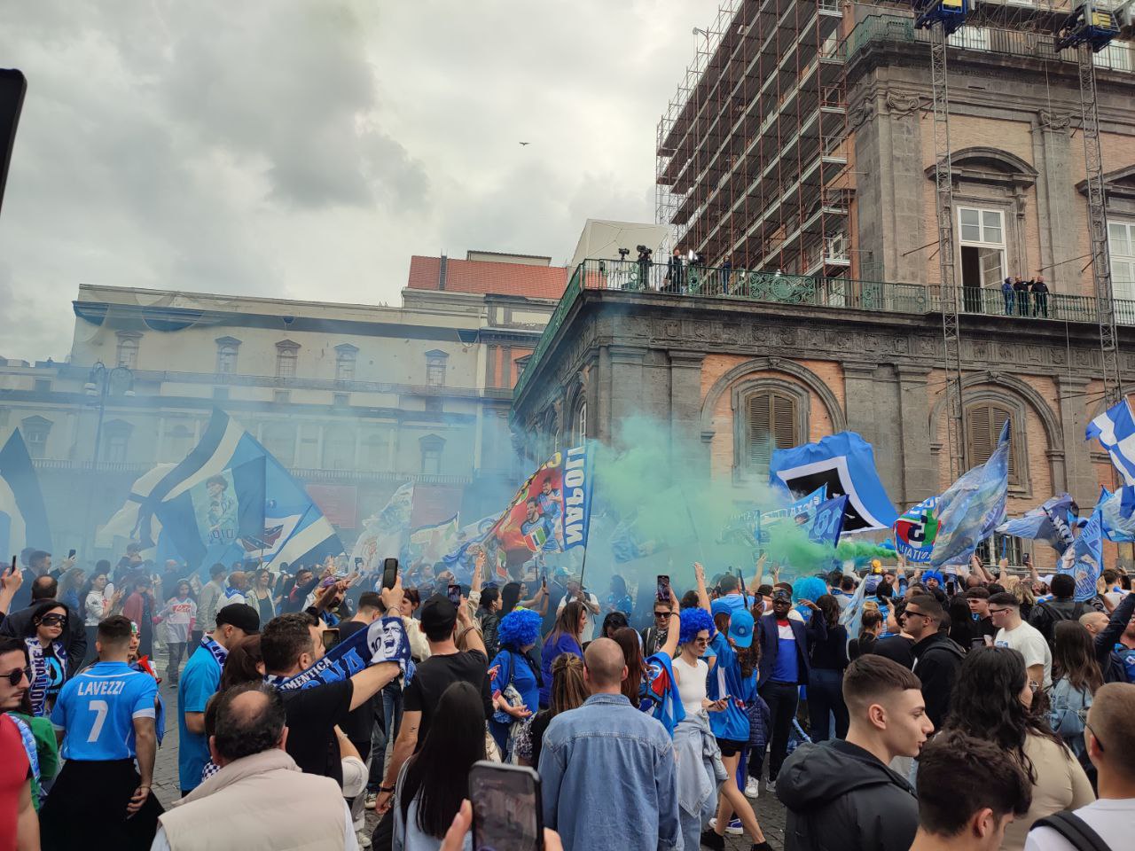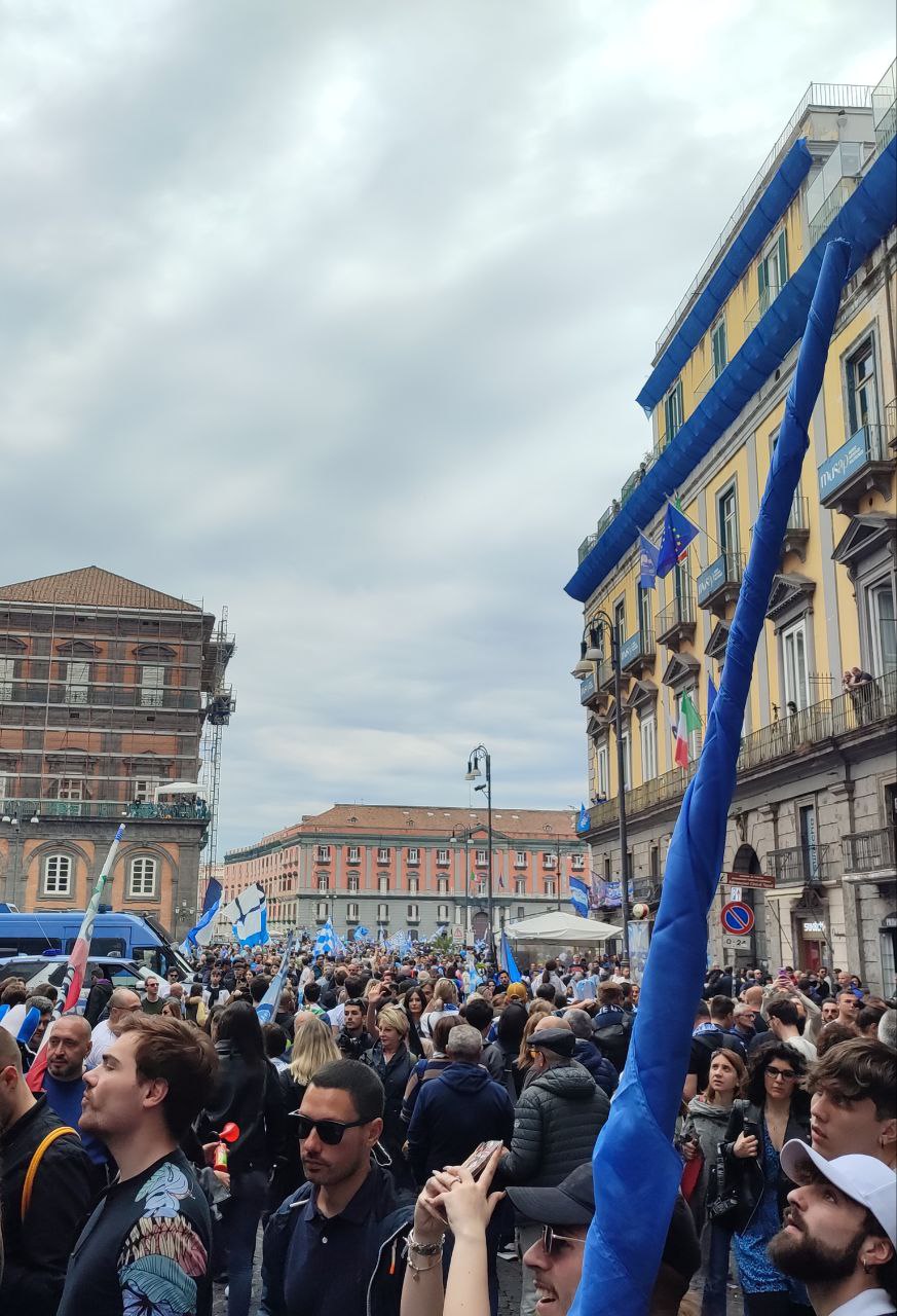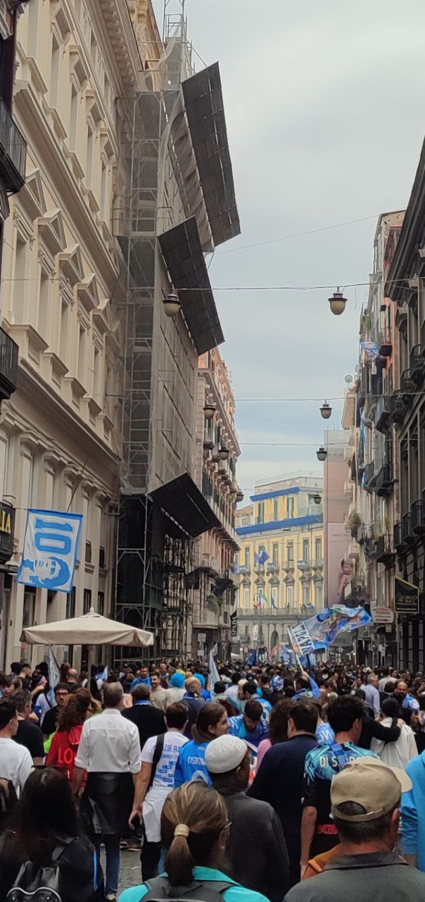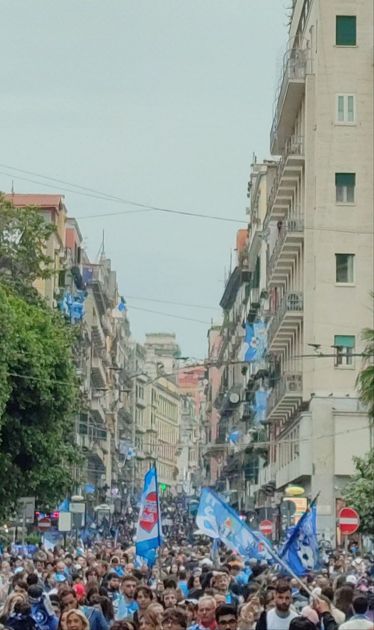La città di Napoli il 30 aprile si è svegliata prestissimo, intorno alle 6 del mattino i cittadini già assaporavano la vittoria del terzo scudetto calcistico mostrandosi affaccendati con i preparativi per la festa imminente. Così, lungo le strade principali i partenopei, alle prime luci dell’alba, si sono mossi per ultimare gli ultimi addobbi con i colori bianco-azzurri, affiancati dal verde, bianco e rosso della bandiera italiana.