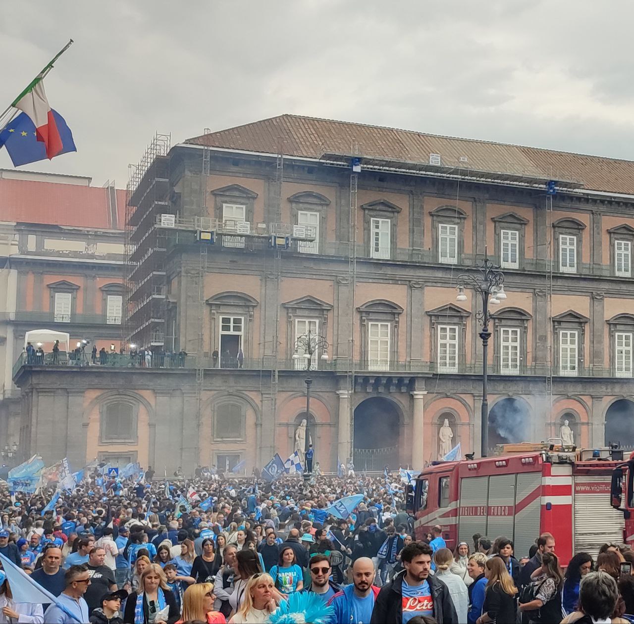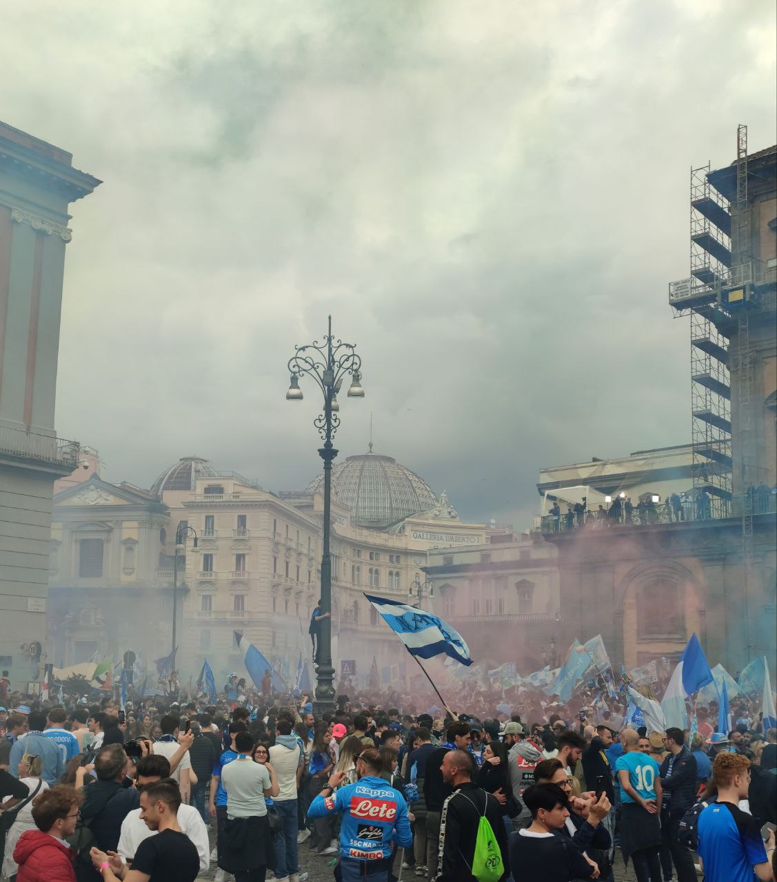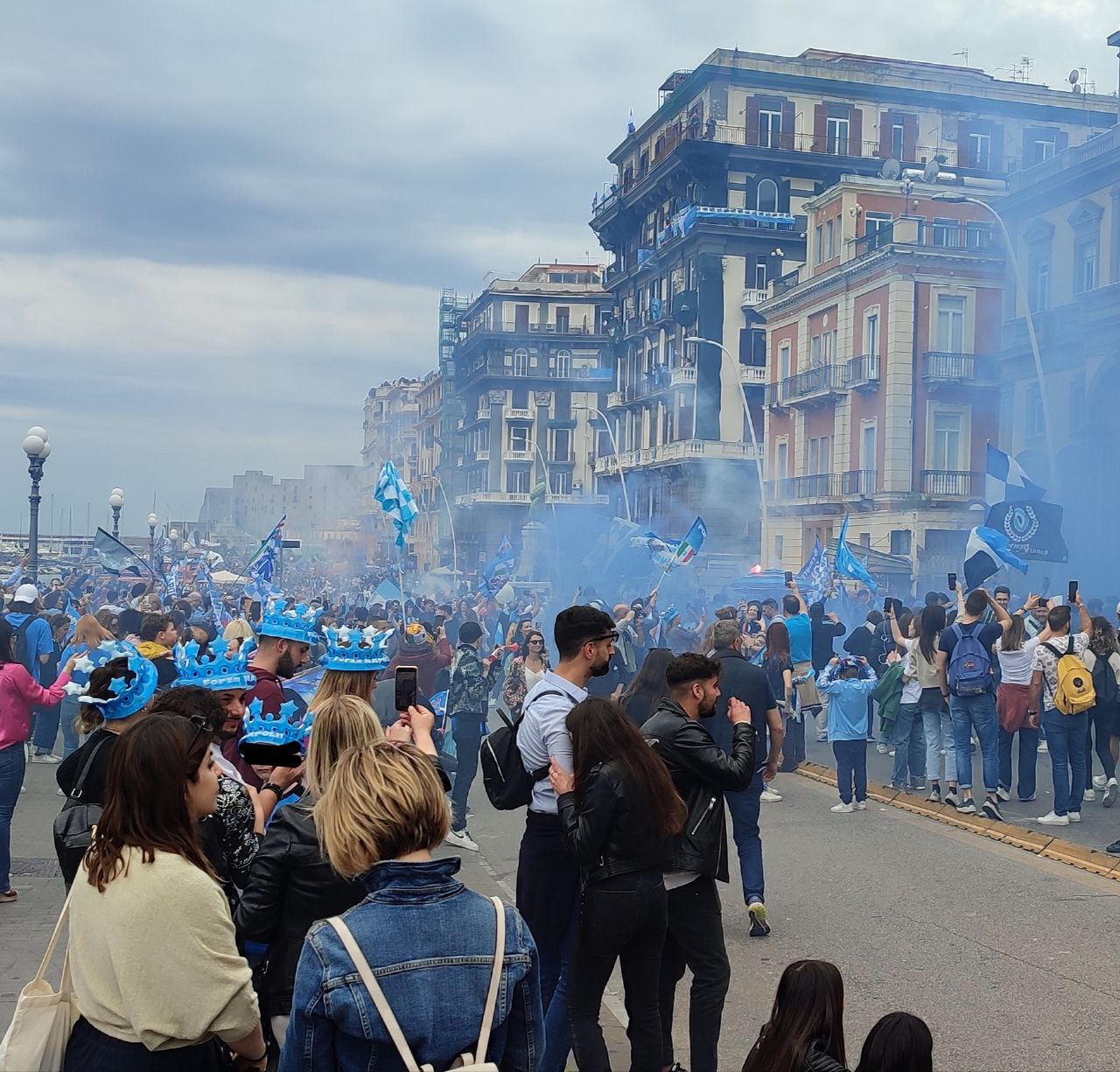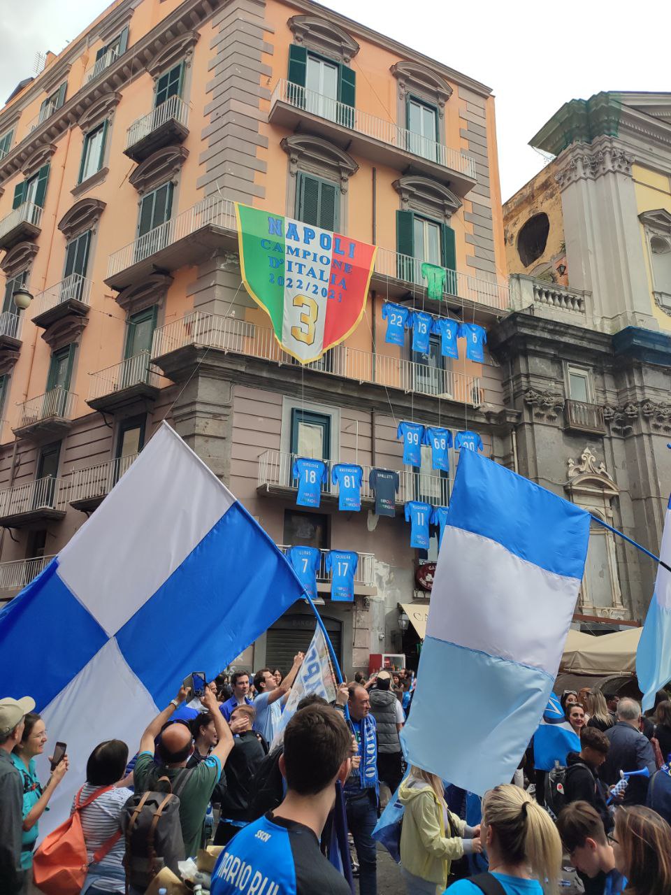 La città di Napoli il 30 aprile si è svegliata prestissimo, intorno alle 6 del mattino i cittadini già assaporavano la vittoria del terzo scudetto calcistico mostrandosi affaccendati con i preparativi per la festa imminente. Così, lungo le strade principali i partenopei, alle prime luci dell’alba, si sono mossi per ultimare gli ultimi addobbi con i colori bianco-azzurri, affiancati dal verde, bianco e rosso della bandiera italiana.