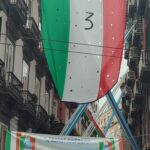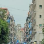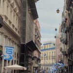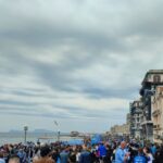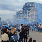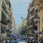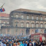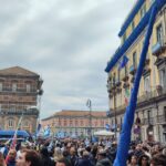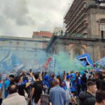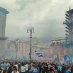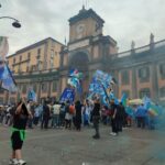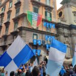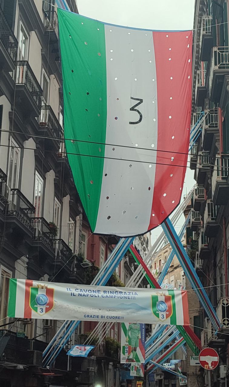 Gli striscioni colorati, sono stati legati alle ringhiere delle balconate e collegati ad alcuni palazzi presenti all’interno dei vicoli napoletani. Le fasce bianco-azzurre attraversano, sospese sopra la carreggiata, gli edifici da un lato all’altro, facendo da cornice e creando quella profondità d’immagine per lo scatto ideale. Nelle immagini di domenica, che circolano online, possiamo anche osservare le innumerevoli bandiere sventolate nelle principali piazze di Napoli: il Tricolore, la bandiera d’Italia abbinata nello stesso tessuto insieme a quella del Calcio Napoli, oltre a quelle classiche bianco-azzurre da stadio.