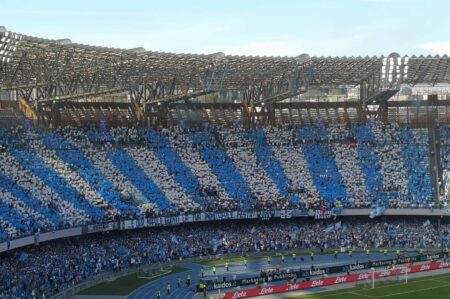 In curva A è stato srotolato uno striscione: “Un popolo nato sotto un cielo azzurro e in riva al mare ha il diritto di sognare, grazie di aver dato a noi e a chi non c’è più un’altra data da ricordare”, mentre la curva B ha risposto con: “E ora Napoli goditi la tua inimitabile festa”. Il sostegno è stato incessante: si è ballato e si è cantato sugli spalti del Maradona, in un tripudio di bandiere.