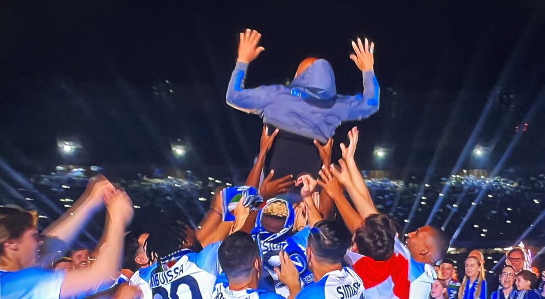 Sul maxischermo dello stadio viene inquadrato anche il presidente del club Aurelio De Laurentiis, che assiste commosso alla festa che andrà avanti all’interno dello stadio fino a tarda serata per i calciatori, le loro famiglie, vip e autorità. Ma anche nelle piazze e nei vicoli della città, pronti a bissare i festeggiamenti di giovedì’ scorso. Per un’altra lunga notte di estasi azzurra.
