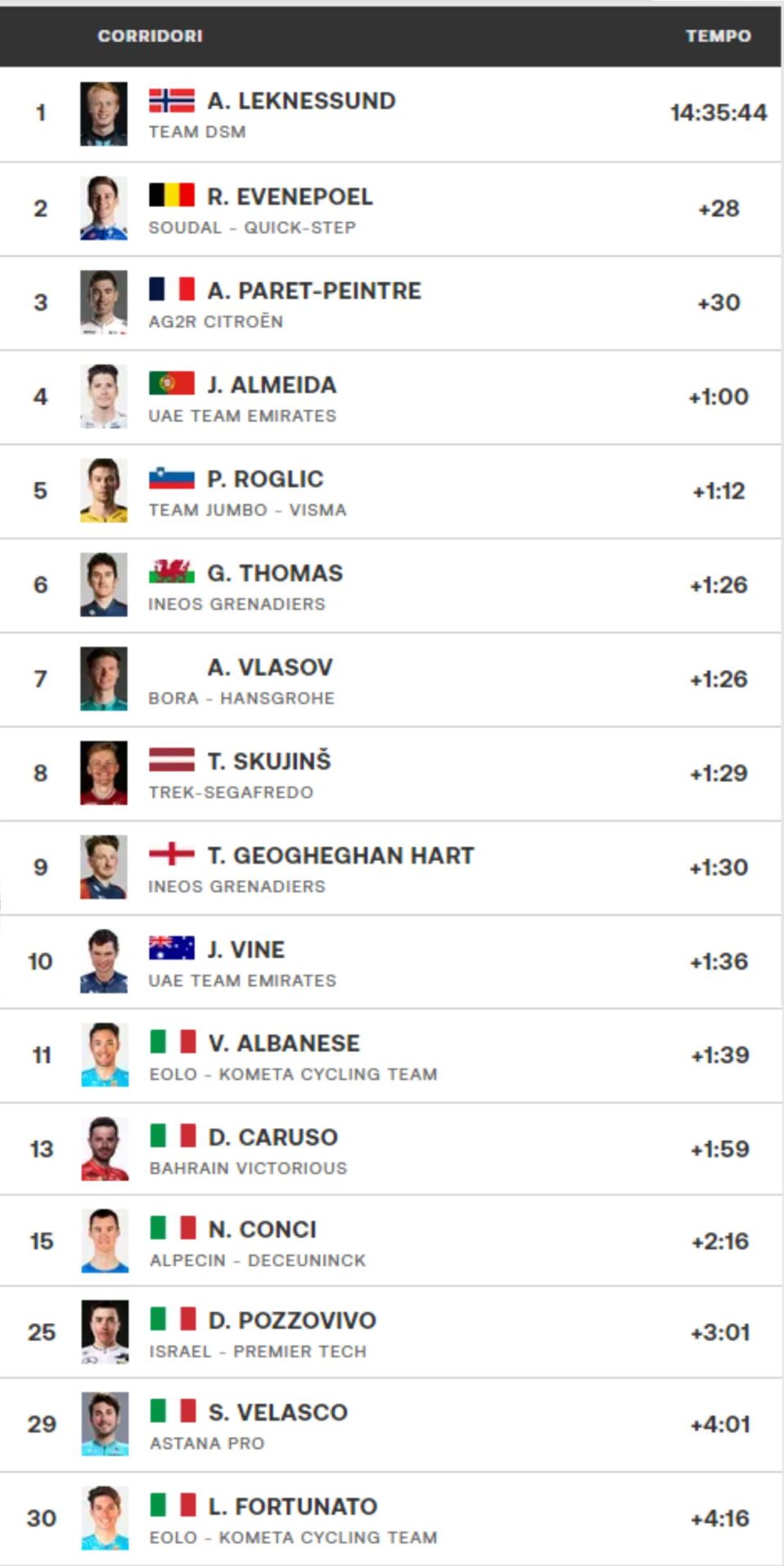 Occhio ancora al belga, che resta al secondo posto a distanza di sicurezza ad appena 28 secondi dal norvegese. Subito dopo proprio il protagonista di oggi, Paret-Peintre, che invece dista 30 secondi dalla Maglia Rosa.
