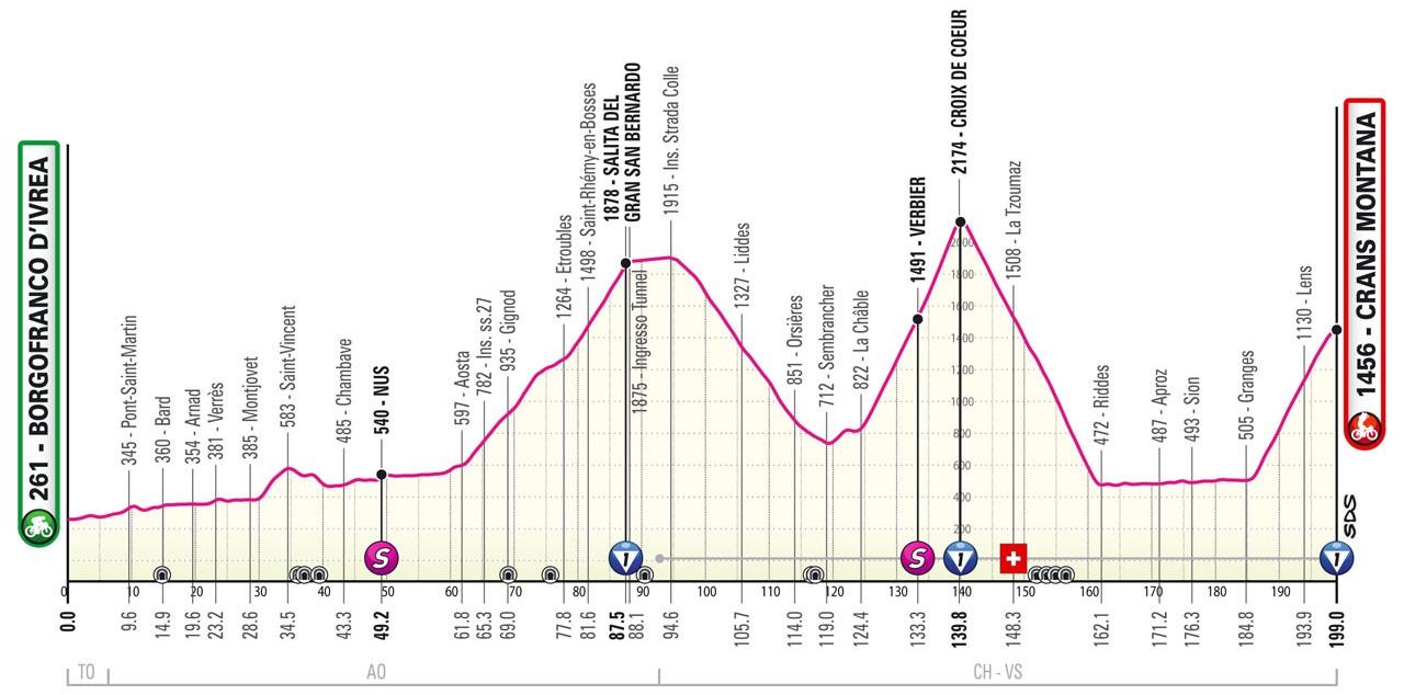 Ma la tappa di oggi non è nulla in confronto a quella che domani i corridori dovranno affrontare: 199 chilometri con arrivo in Svizzera a Crans Montana. Si parte da Borgofranco d’Ivrea con una salita costante, fino ad arrivare ad oltre 2000 metri sul livello del mare.