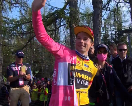 Oggi, dopo i due chiaramente più forti di questo Giro, il portoghese Joao Almeida (Team Uae Emirates) staccato di 0.42″ da Roglic, ottimo quarto l’italiano Damiano Caruso (Team Bahrain-Victorious) a 0.55″.
